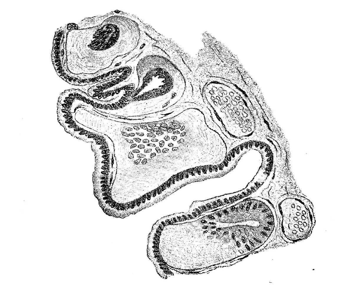 Изучая цѣлый рядъ препаратовъ при различной обработкѣ, не трудно убѣдиться, что передъ нами ничто иное, какъ особеннымъ образомъ перерожденныя железы. Дѣйствительно, на препаратахъ отчетливо видно, какъ клѣтки железъ разбухаютъ, дѣлаются гомогенными и сливаются между собою до полнаго исчезновенія границъ. Ядра, сохраняя круговое расположеніе, постепенно сдвигаются къ центру и какъ будто заключаются въ особую оболочку.