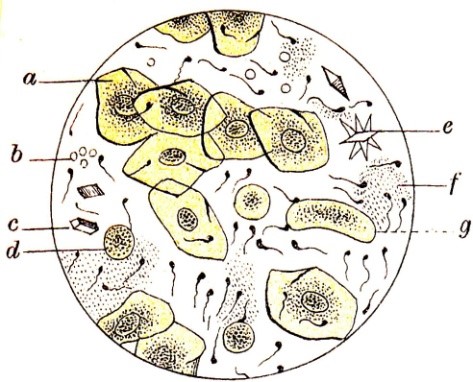 Своды. Незначительное количество содержимаго щелочной реакціи. Изъ зѣва не выдается слизистая пробка. Нитей много, около половины ихъ безъ движенія. Приблизительно 1/3 часть живчиковъ недоразвиты.