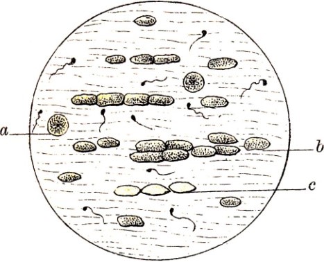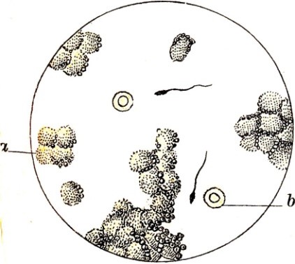 Что же касается до возраженія, которое можетъ быть сдѣлано, что сѣмянныя нити могли быть занесены искусственно въ полость матки зондомъ-канюлей, то противъ этого говорятъ многочисленные микроскопическіе препараты (ф. рис. 3-й), на которыхъ, при правильно обставленныхъ опытахъ, рядомъ съ живчиками видны только форменные элементы, свойственные полости матки. Между тѣмъ ясно, что если-бы живчики были механически занесены въ полость матки, то вмѣстѣ съ ними были бы увлечены въ полость матки изъ нижележащихъ отдѣловъ половой трубки форменные элементы влагалища и канала шейки.