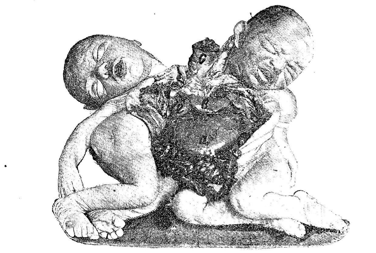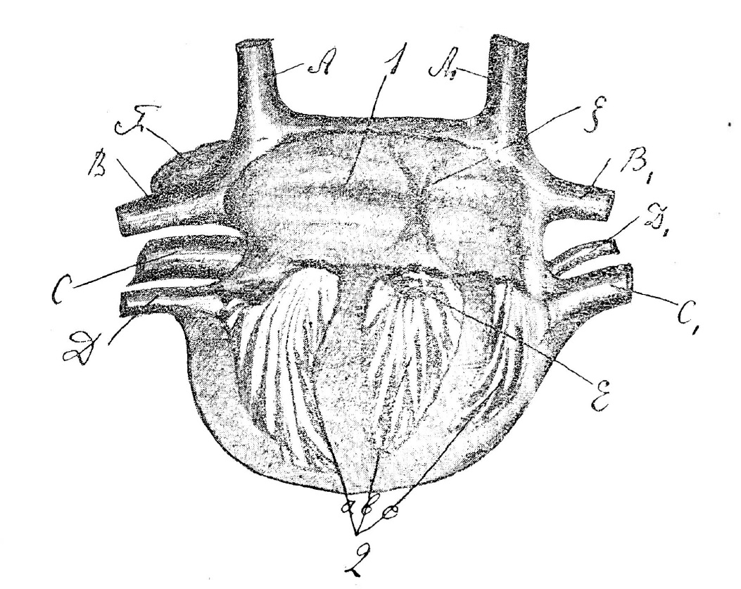 Послѣ разрѣза покрововъ по средней линіи между обоими плодами оказывается, что грудная кость имѣется общей, въ видѣ мостика, съ небольшою вогнутостью внизъ, шириною въ палецъ, а длиною въ 4 поперечныхъ пальца. Края верхнихъ реберъ соединены между собою хрящемъ, составляющимъ отростокъ грудной кости, а края нижнихъ фиброзною тканью. При вскрытіи грудной полости оказывается слѣдующее. Срединную часть грудной полости занимаетъ сердце, общее для обоихъ плодовъ, лежащее въ околосердечной сумкѣ; въ полости сумки, по вскрытіи ея по средней линіи, обнаружено небольшое количество серозно-красноватой жидкости. Сердце имѣетъ почкообразную форму съ нижнимъ закругленнымъ краемъ и верхнимъ слегка вогнутымъ. Размѣры сердца слѣдующіе: поперечный діаметръ—5,5 см.; продольный—3,2; толщина около 2 см. По верхнему вогнутому краю имѣются два ушка, обращенныя другъ къ другу. На передней поверхности замѣчаются отпечатки вѣнечныхъ сосудовъ, изъ которыхъ два главныхъ, идущіе до верхушки, расположены нѣсколько влѣво отъ срединной точки нижняго края. Этими сосудами передняя поверхности какъ-бы подраздѣляется на 3 части—среднюю треугольную, верхушкой обращенную книзу и основаніемъ кверху, равнымъ 3 см.; правую большую и лѣвую меньшую, неправильно вытянуто-заостренную. При отворачиваніи сердца кверху по задней его поверхности, вверху замѣчается болѣе тонкая перепончатая часть, соотвѣтствующая общему предсердію. На этомъ предсердіи съ обѣихъ сторонъ видны небольшія мѣшковидныя расширенія, переходящія каждое въ соотвѣтствующую vena cava inferior. На нижней поверхности праваго расширенія замѣчается хорошо развитое ушко, обращенное верхушкой снизу вверхъ и вправо; на лѣвой сторонѣ ушка нѣтъ. По вскрытіи предсердія поперечнымъ разрѣзомъ оказывается, что въ средней части его имѣется небольшая перемычка въ видѣ неполной перегородки, частью фиброзной, частью мышечной. Въ правой половинѣ предсердія отъ наружной стѣнки отходитъ тонкая перегородка, содержащая мышечныя волокна. Эта перегородка дѣлитъ правый мѣшокъ на два кармана передній и задній. Въ передній карманъ тотчасъ подъ отросткомъ ушка впадаетъ vena cava superior. Въ устьѣ ея замѣчается два тонкихъ полулунныхъ клапана. Въ верхній карманъ открываются легочныя вены. На лѣвой сторонѣ предсердія перегородки не замѣчается, а vena cava superior открывается въ верхній наружный уголъ предсердія. Легочныя вены открываются въ небольшое мѣшковидное расширеніе, расположенное въ нижней наружной части предсердія; это расширеніе представляется въ видѣ округлой полости величиною въ горошину, соединяющейся узкимъ отверстіемъ съ полостью предсердія. Послѣ вскрытія сердца по нижнему краю обнаруживается въ немъ, соотвѣтственно замѣченнымъ по передней поверхности сердца отдѣламъ, три полости, соединяющіяся съ общимъ предсердіемъ тремя отверстіями; послѣднія снабжены клапанами. Изъ лѣвой полости отходитъ аорта лѣваго плода, отъ ея устья на разстояніи 2 см. отходятъ съ верхней части обѣ art. carotides et subclaviae, съ нижней же части отходитъ Боталовъ протокъ, который открывается въ одну изъ вѣтвей art. pulmonalis; онъ уже, но длиннѣе Боталова протока, находящагося на правой сторонѣ. Стволъ art. pulmonalis лѣваго плода, подходя къ сердцу, показываетъ въ этомъ мѣстѣ небольшое мѣшковидное расширеніе, повидимому, слѣпое, такъ какъ ни изъ желудка не удалос