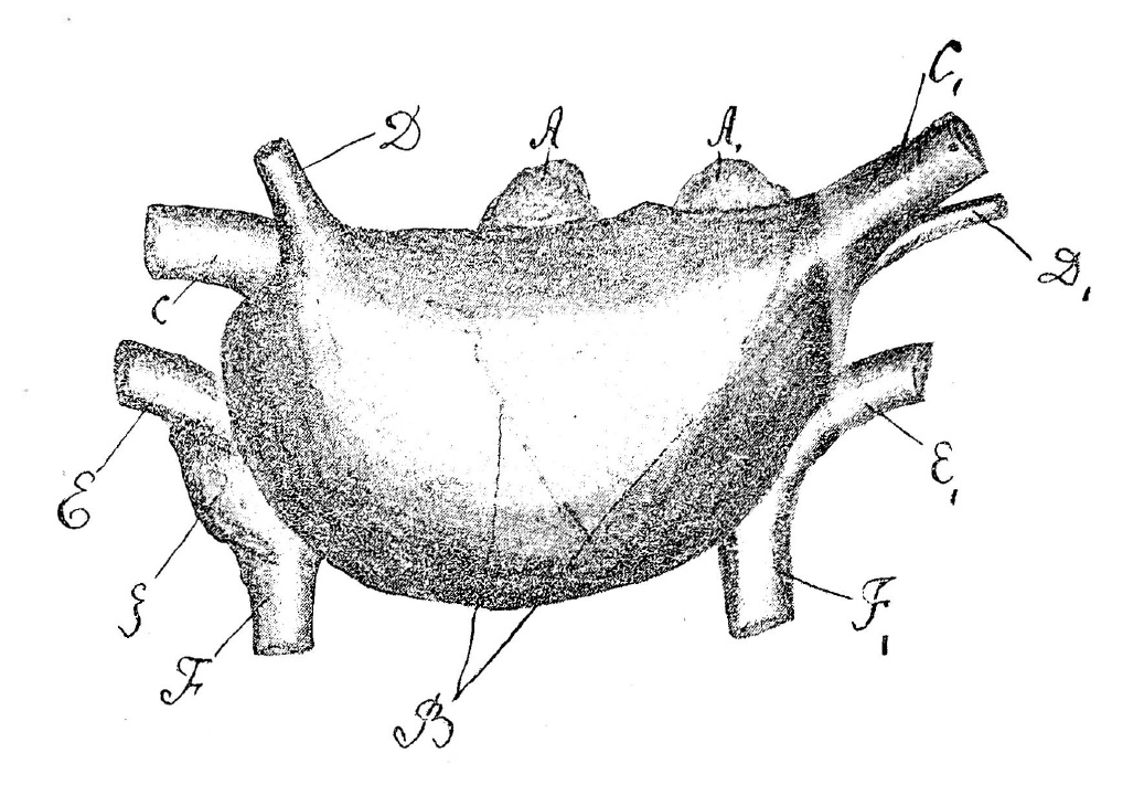 Рис. 1. Передняя поверхность сердца: АА1— ушки; В ― отпечатки вѣнечныхъ сосудовъ; CC1 — аорты; DD1 — легочныя артеріи; ЕЕ1 — верхнія полыя вены; FF1 — нижнія полыя вены; G—ушко, сидящее на соединеніи правыхъ полыхъ венъ. (Схематические изображеніе).