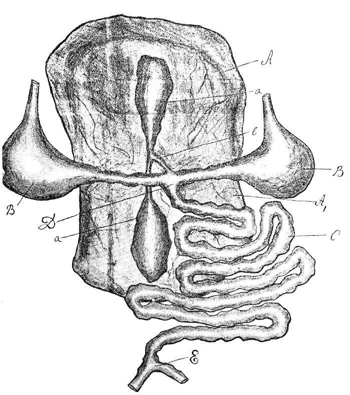 Рис. 3. AA1 — сросшіяся печени задними краями: аа1 — желчные пузыри; b — слившійся желчный протокъ. ВВ1 — желудки; С—кишки; D — мѣсто сліянія двѣнадцатиперстныхъ кишекъ; Е — мѣсто бифуркаціи тонкихъ кишекъ. (Схематическое изображеніе).