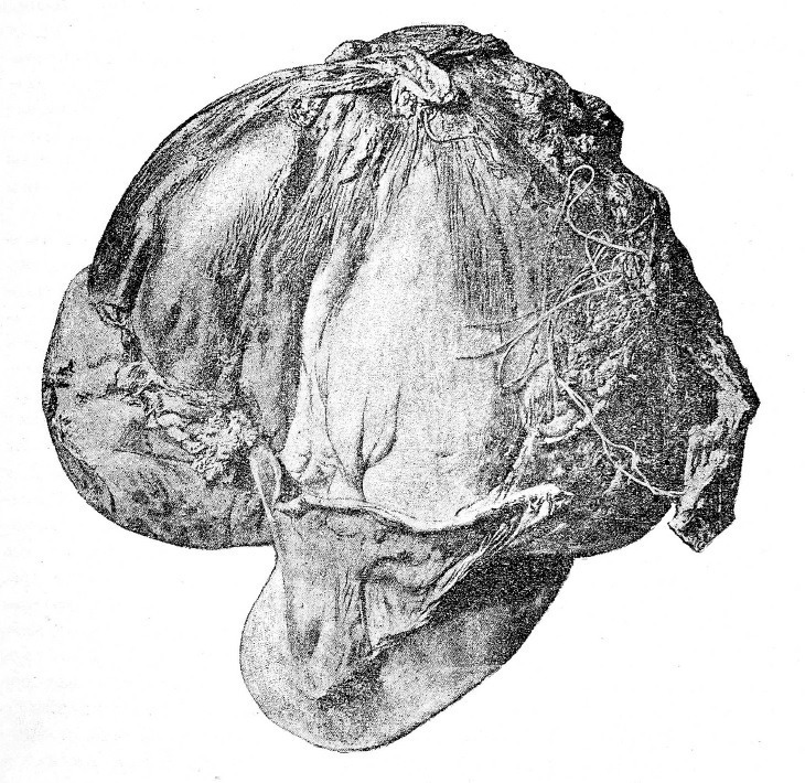 Опухоль оказалась вѣсомъ 1638,04; размѣры: въ ширину 21, сверху внизъ 20, въ вышину 6 цтм., поверхность ея гладкая, блестящая, розоваго цвѣта, усѣяна синеватыми островками. Она представляется состоящею изъ двухъ отдѣловъ, нижній отдѣлъ помѣщавшійся въ заднемъ дугласовомъ пространствѣ, какъ это видно на прилагаемомъ рисункѣ, представляетъ собою, какъ будто въ нѣсколько разъ увеличенный яичникъ. Въ разрѣзѣ этотъ отдѣлъ опухоли, представляетъ плотную массу и видъ однообразный на подобіе сала. Нѣкоторые отдѣлы верхней части опухоли представляютъ размягченные узлы и въ разрѣзѣ они представляются сочными и раздѣленны трабекулами на отдѣльныя полости.