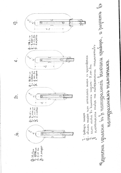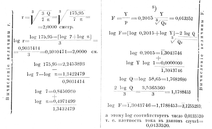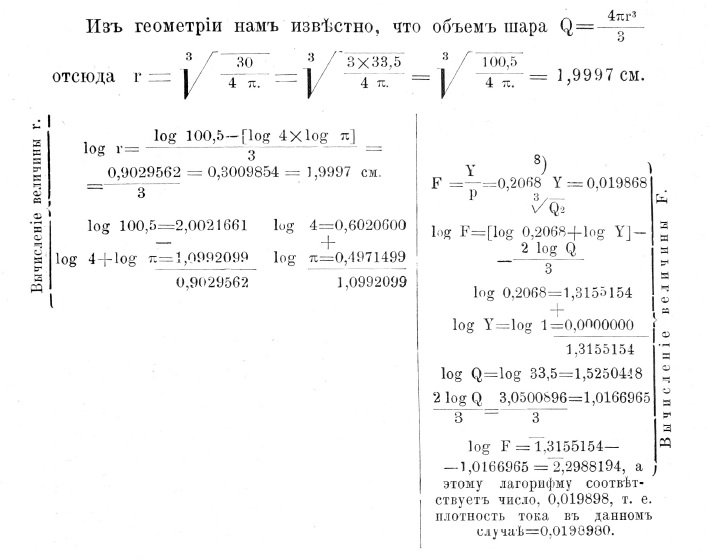 3) Сочетанія шара съ цилиндромъ двойной высоты (см. черт. С.) т. е. емкость тампона равняется емкости сочетанія шара съ прямымъ цилиндромъ, имѣющихъ площадями своихъ основаній площадь большого круга даннаго шара, а высотою два радіуса того же шара, объемъ этотъ Q= при наполненіи изъ градуированнаго сосуда найденъ равнымъ 83,75 куб. см.; дѣлая вычисленія по предыдущему способу, получимъ радіусъ г. будетъ ровенъ 1,9298 см. а плотность тока F°=0,0099416 при силѣ тока Y въ 1-нъ милліамперъ.
