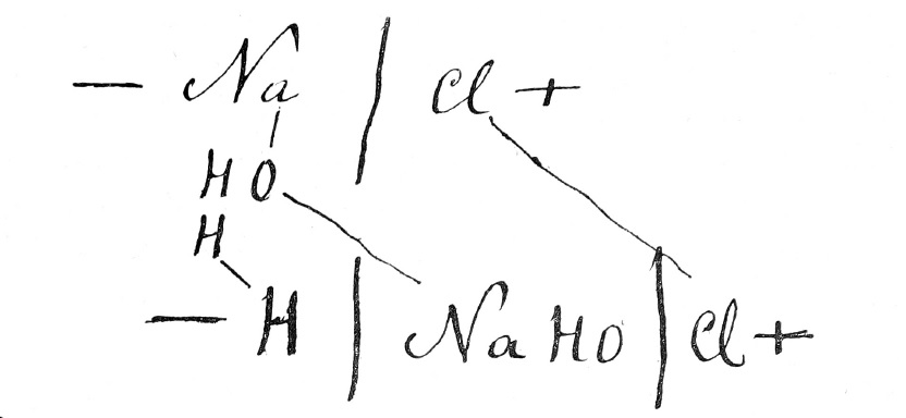 И такъ въ концѣ электролитической реакціи; въ растворѣ поваренной соли, на катодѣ выдѣлится электроположительный водородъ (Н), который по малой склонности къ растворенію въ водѣ, останется въ газообразномъ состояніи; на анодѣ станетъ выдѣляться электроотрицательный (сі) и растворяется въ водѣ (въ одной части по вѣсу воды можетъ раствориться 2 части хлора), въ растворѣ же появится кромѣ того и ѣдкій натръ Na Но.
