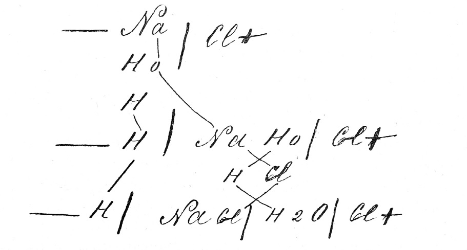 т. е. въ концѣ реакціи на катодѣ выдѣлится свободный газообразный водородъ (Н), на анодѣ растворяющійся въ жидкости хлоръ (С1) и кромѣ того въ растворѣ изъ частицы ѣдкаго натра (Na Но) и солянной кислоты (Н С1) возстановится одна частица поваренной соли (Na Cl) и одна воды (Н2 0).