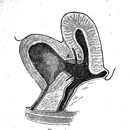 Дабы освободить верхній край фистулы и сдѣлать его подвижнѣе я поступилъ слѣдующимъ образомъ. Я разсѣкъ въ поперечномъ направленіи (см. рис. 1 линія между а и b) край фистулезнаго отверстія, прошелъ черезъ рубцовую ткань (затушевана на рис. 1) и проникъ на глубину 11/2 сантиметра въ толщу маточной ткани, придерживаясь передней поверхности матки. Вслѣдствіе этого отдѣлъ а (Рис. 1) сдѣлался подвижнымъ и мнѣ удалось стянуть его нѣсколько внизъ. Вырѣзавши послѣ этого рубцовую ткань на передней губѣ матки: ту часть, которая находится ниже буквы b (Рис. 1), я укрѣпилъ лоскутъ а (Рис. 1 и Рис. 2) въ верхнемъ углу раны (на самомъ рисункѣ это нижній уголъ Рис. 2), сшивши её въ продольномъ направленіи по средней линіи. Видъ получился такой (Рис. 3).