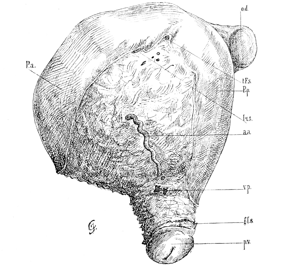 Объясненіе рисунка. Препаратъ, вылущенной по способу Doyen, матки (безъ предварительной перевязки чего либо —sans hémostase préalable). Интерстиціальная фиброміома; опухоль доходила до пупка (опер. 27/х 1896, прод. опер. 55 мин. Выпис. здоровой). P. а. -paries anterior uteri; p. p.—paries posterior uteri; p. v.—portio vaginalis; f. I. s.—fornix vaginalis sinister; v. p.—venae persectae; l. r. s.—ligamentum rotundum sinistrum; t F. s.—tuba Yallopiana sinistra (persecta); a. a.—arcus arteriosus— анастомозъ между arteria uterina n art. ovarica.