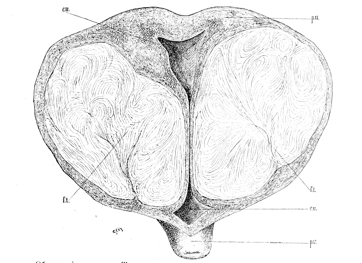 Объясненіе рисунка. Продольный разрѣзъ препарата, изображеннаго па рис. 1 и рис. 2 - Р. и — paries uteri; с. u.—cavum uteri; p. v.—portio vagi-