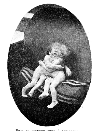 Правая половина лица одного плода соединится съ лѣвой половиной лица другого плода и наоборотъ. Такимъ образомъ получится одна голова и два лица, расположенныя на противу- положныхъ ея сторонахъ, при чемъ одна половина каждаго лица будетъ принадлежать одному плоду, а другая половина—другому плоду; тѣмъ не менѣе по внѣшнему виду каждое лицо представляется вполнѣ нормальнымъ. Лица эти по отношенію ко всему уроду будутъ переднимъ и заднимъ, но по отношенію къ каждому изъ слившихся плодовъ—вполнѣ боковыми.