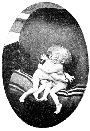 Грудные отдѣлы и верхніе отдѣлы живота обоихъ плодовъ подверглись совершенно тождественному процессу сліянія. Половинки грудной клѣтки съ ея содержимымъ одного плода вмѣсто того, чтобы соединиться между собою, расходясь направо и налѣво (считая отъ позвоночника), приходятъ въ соприкосновеніе и сливаются съ развернутыми обѣими половинками грудной клѣтки и ея содержимаго, принадлежащихъ другому плоду. Такимъ образомъ формируются двѣ переднія грудныя стѣнки, по внѣшнему виду вполнѣ нормальныя и расположенныя въ той-же плоскости, что и лица, и перпендикулярно поверхности спинъ. Совершенно тоже должно сказать и о верхнемъ отдѣлѣ живота выше пупка; ниже же его расположеніе живота каждаго плода вполнѣ отвѣчаетъ нормѣ.