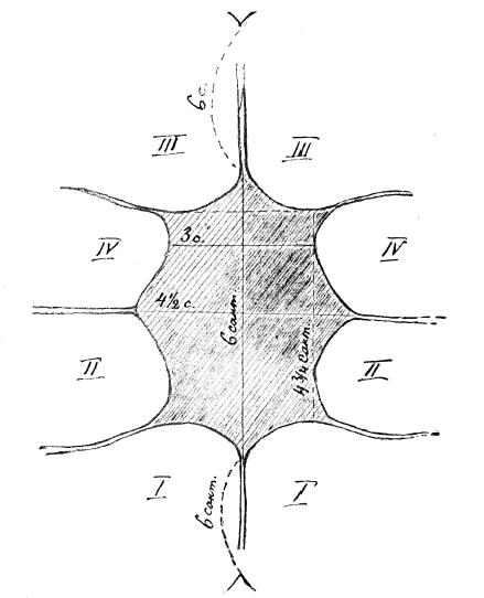 Ощупывая общую голову, убѣждаемся, что надъ позвоночнымъ столбомъ каждаго плода имѣется затылочная кость, а впереди ея—двѣ темянныя кости; между ними правильно образованный малый родничекъ. Впереди темянныхъ костей лежитъ по 2 лобныхъ кости съ каждой стороны, расположенныхъ совершенно иначе, чѣмъ въ нормѣ: онѣ развернуты въ стороны и вмѣсто перпендикулярнаго положенія къ темяннымъ костямъ онѣ лежатъ въ одной съ ними плоскости; при этомъ правая лобная кость одного плода соединяется помощью шва съ лѣвой лобной костью другого и наоборотъ, образуя такимъ образомъ по лбу для каждаго изъ описанныхъ лицъ. Въ силу этого оба большихъ родничка сливаются въ одинъ общій большой родничекъ. Многоугольная форма его опредѣляется взаимнымъ положеніемъ костей и видна изъ прилагаемаго чертежа въ натуральную величину съ обозначеніемъ размѣровъ въ сантиметрахъ (рис. № 3)
