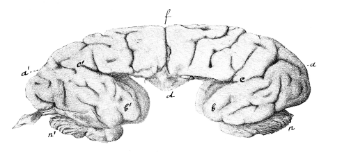 Такимъ образомъ, если смотрѣть со стороны лицъ, общая мозговая масса представляется раздѣленною на 4 приблизительно одинаковаго устройства квадранта. На противуположныхъ концахъ 2 смежныхъ (со стороны лицъ) квадрантовъ видны хорошо развитыя затылочныя доли (а, а'; рис. № 5). По направленію внизъ внѣ переходятъ въ височныя доли (b, Ь'), не представляющія въ своемъ устройствѣ ничего особеннаго. Внутренніе (они-же передніе) концы 2 височныхъ долей находятся въ разстояніи другъ отъ друга около 2-хъ сантиметровъ. Височныя доли отдѣлены отъ вышележащихъ темянныхъ и лобныхъ долей Сильвіевой бороздой (с, с')« Въ промежуткѣ между височными доляма поднимаются въ видѣ возвышенія треугольнаго очертанія нижнія поверхности слившихся лобныхъ долей (d).