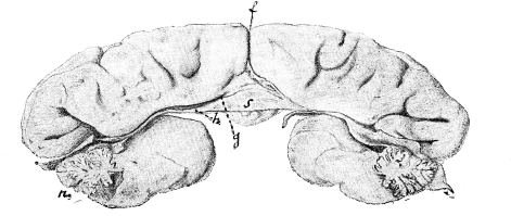 Поверхность этой соединительной части мозга, обращенная къ затылочно-затылочной бороздѣ, почти плоская и на срединѣ ея начинается борозда (g), идущая горизонтально по направленію къ обоимъ затылкамъ, сначала мелкая, но затѣмъ постепенно углубляющаяся. Эта борозда (fissura hyppocampi) на каждой сторонѣ образуется нижнимъ краемъ каждаго изъ квадрантовъ съ одной стороны, съ другой—нижележащей полоской мозговаго вещества, которая, начинаясь также отъ средней общей части 2-хъ квадрантовъ каждой стороны, направляется въ сторону затылка подъ нижнимъ краемъ полушарія. Истончаясь она дугообразно изгибается и переходитъ въ бахрэмку Аммоніева рога. Такимъ образомъ эта полоска должна быть признана за заднюю ножку свода (по одной на каждой сторонѣ) (h).