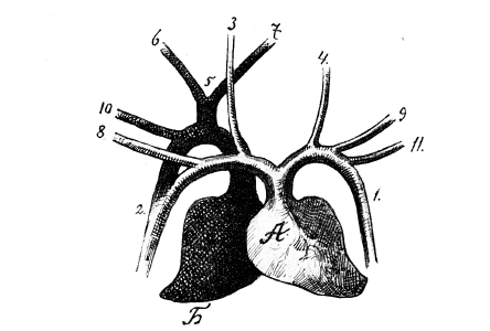 Восходящая аорта со стороны лица А (см. схематич. рисунокъ № 7) дѣлится на правую и лѣвую аортальныя дуги, переходящія въ 2 нисходящія аорты, лежащія у того и другого позвоночника.