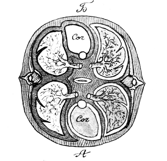 И такъ въ общей грудной полости имѣются 4 отдѣльныхъ серозныхъ полости: 1) только что упомянутая общая для одного сердца и 2 легкихъ, 2) полость околосердечной сумки со стороны лица А. 3) полость плевры лѣваго легкаго со стороны того-же лица и 4) полость плевры праваго легкаго со стороны лица Б.