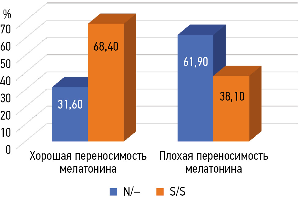 In patients with poor tolerance to melatonin, the frequency of the wild-type (N) allele was significantly higher (38.1%) than in patients with good tolerance to the drug (17.1%) (Table 4).