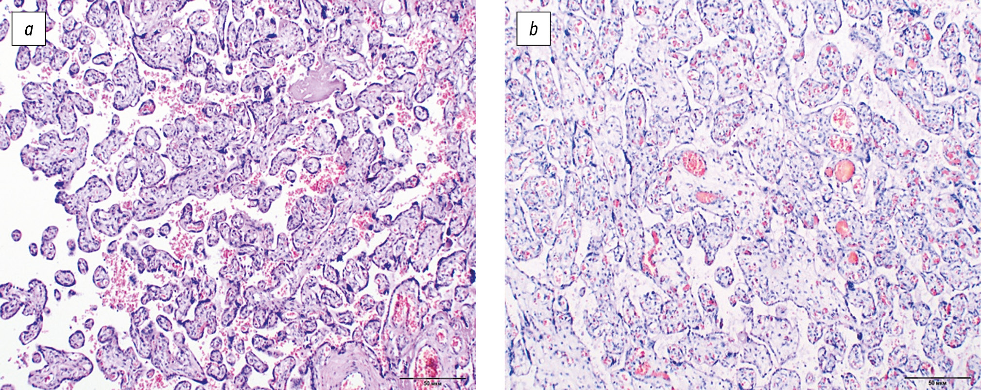 Fig. 1. The structure of the villous chorion: (a) terminal type of structure of the villous tree of the placenta at full-term pregnancy (staining with hematoxylin and eosin, ×100); (b) dissociated chronic placental insufficiency (staining with hematoxylin and eosin, ×100)