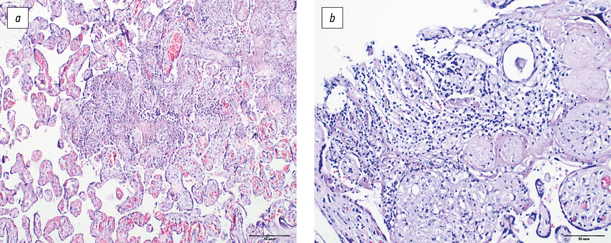 Fig. 2. Hematogenous infection of the placenta: (a) desquamative-dystrophic changes in the chorial epithelium with perifocal deposition of fibrinoid masses and lymphoid infiltration (staining with hematoxylin and eosin, ×100); (b) fibrinous-desquamative intervillositis (staining with hematoxylin and eosin, ×200)