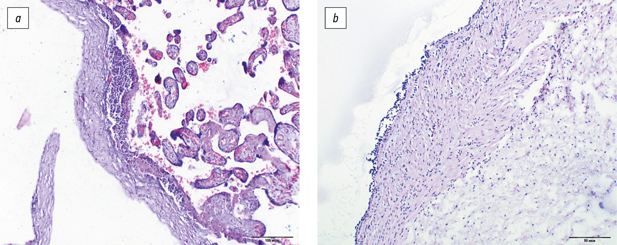Fig. 3. Ascending bacterial infection of the placenta: (a) exudative infiltration of the chorionic plate and subchorial space (placental chorioamnionitis, subchorial intervillositis) (staining with hematoxylin and eosin, ×100); (b) accumulations of leukocytes in the vein wall with penetration into the Wharton’s jelly (phlebostromal funiculitis) (staining with hematoxylin and eosin, ×100)