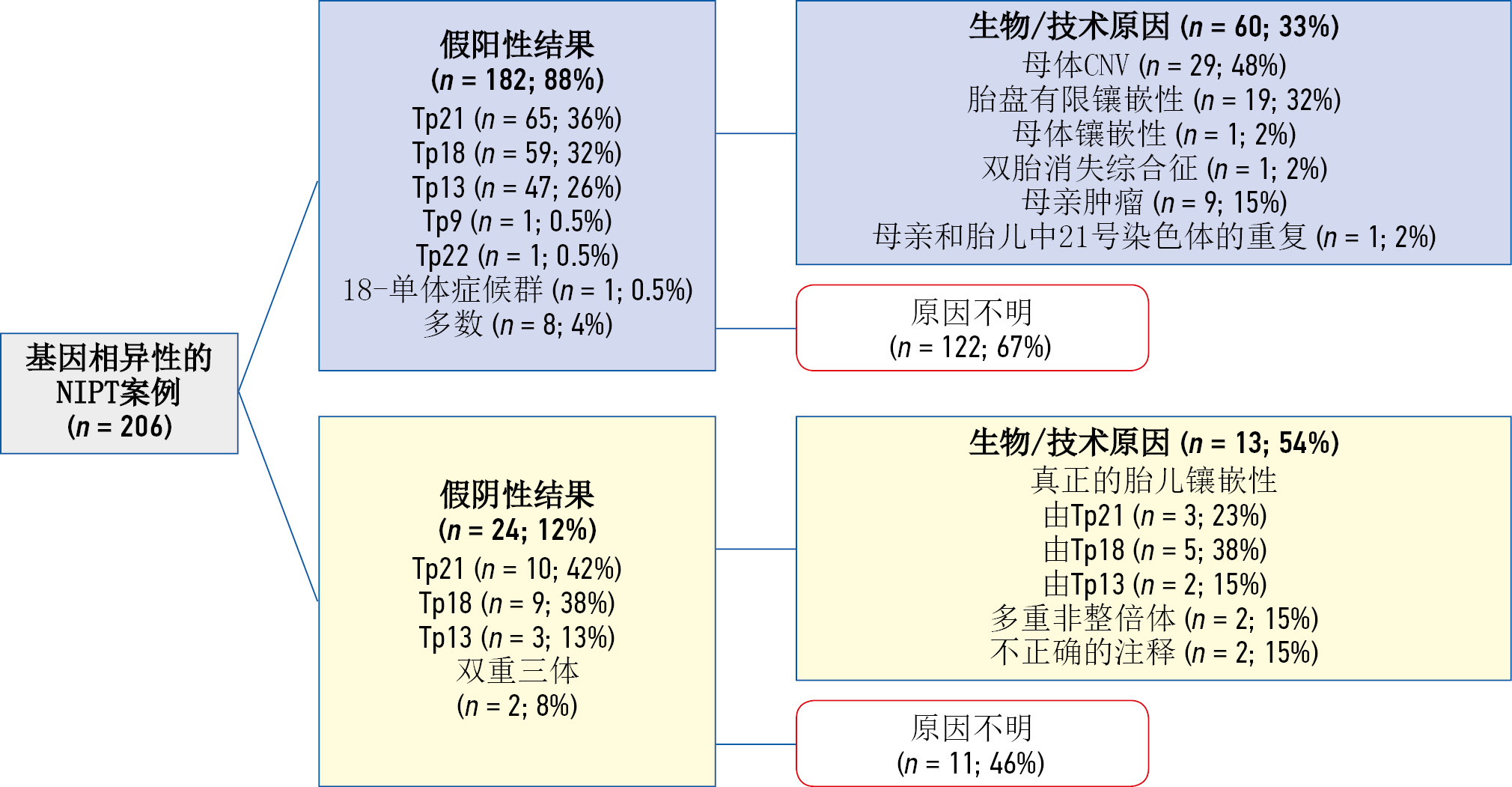 在许多研究中提到的假阳性和假阴性结果的最常见原因包括:确诊或假定FF低。确认胎儿或母亲的染色体镶嵌性;母体DNA区域拷贝数的变异(CNV);技术和人为因素。在大多数的情况下,无法确定原因。