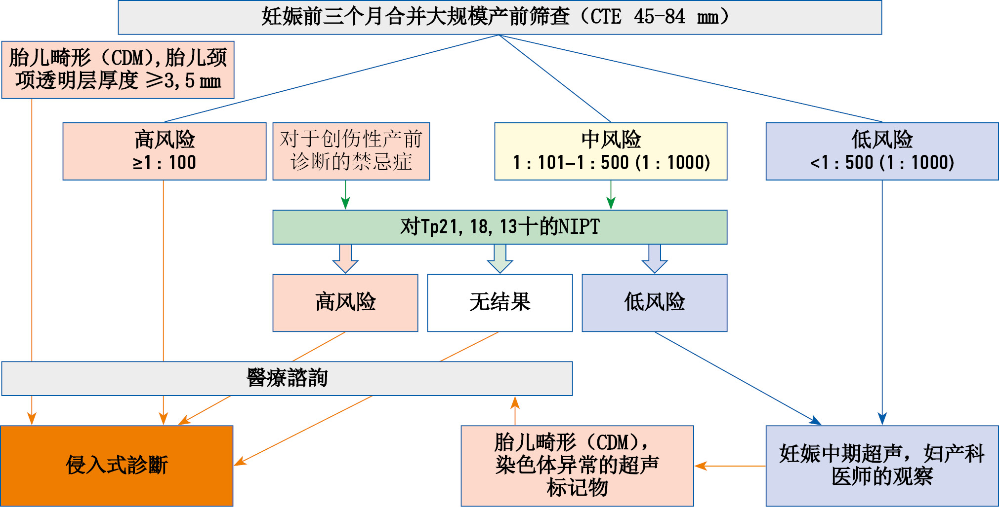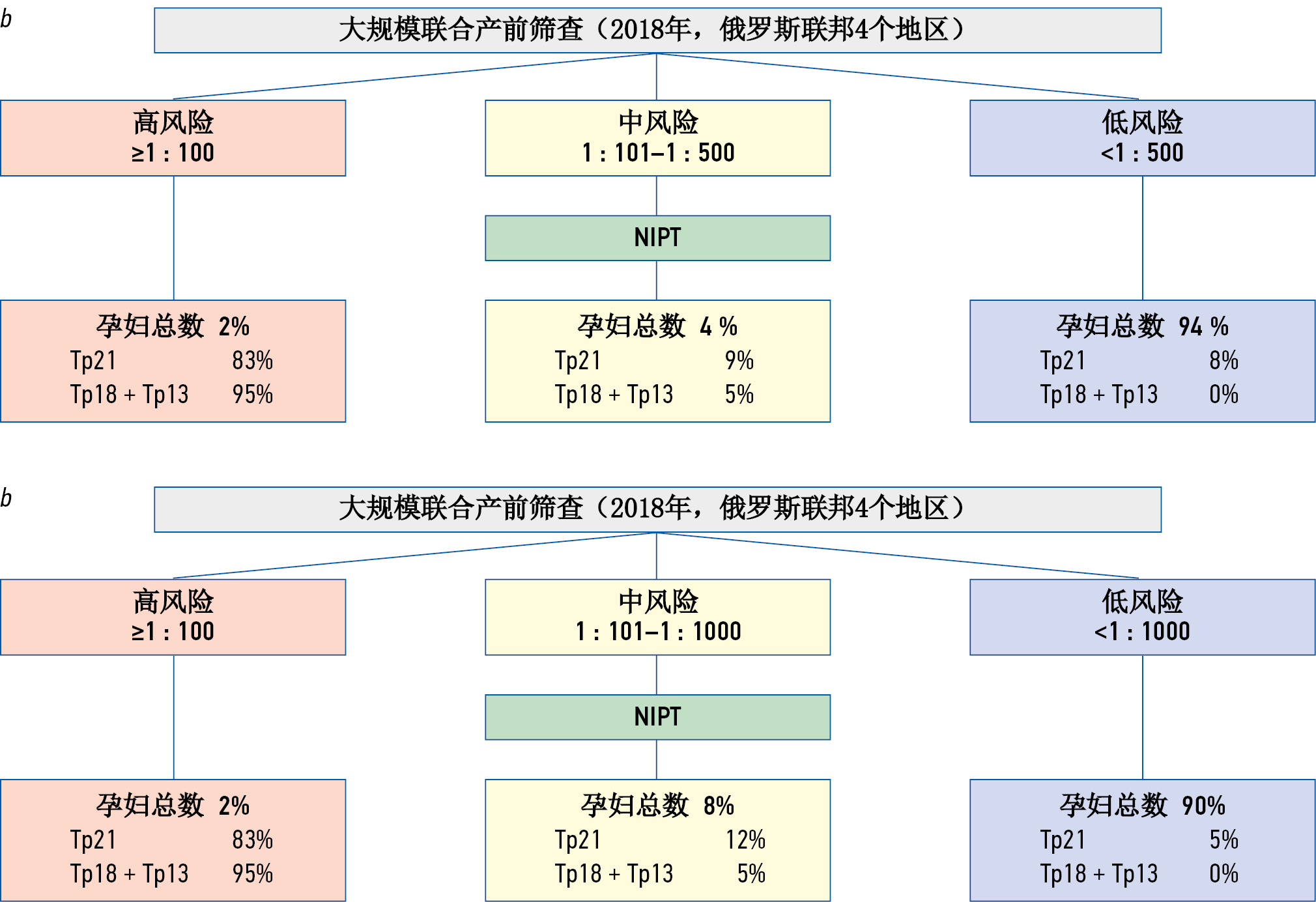 最成功和最受欢迎的是胎儿医学基金会(FMF, 领导人 - Kypros Nicolaides教授,伦敦)教授开发的方法,由受过专门训练和执照的专家将早期产前筛查(RPS)与超声相结合的方法,研究母血的血清标记物以及计算妊娠11-14周时染色体异常的个体风险。在计算风险时,要考虑基本风险(产妇年龄和胎龄)以及重要因素的似然比:既往史的一系列指标和产妇状况,超声和血清标记物[绒毛膜促性腺激素的游离β亚基和与妊娠相关的血浆蛋白质A(PAPP-A)][1]。一项系统化的考科蓝综述根据上述算法分析了妊娠晚期唐氏综合征(Tr21)联合产前筛查的数据。该综述收录了31年来的152篇出版物(对8454例Tr21的164040个筛查结果), 显示筛查敏感性超过90%,假阳性结果为3-5%。 这种筛查模式的效果还表现在染色体异常高危组的数值和侵入性手术的次数急剧下降,以前主要是根据产妇年龄和血清标记物指标来判断[2]。