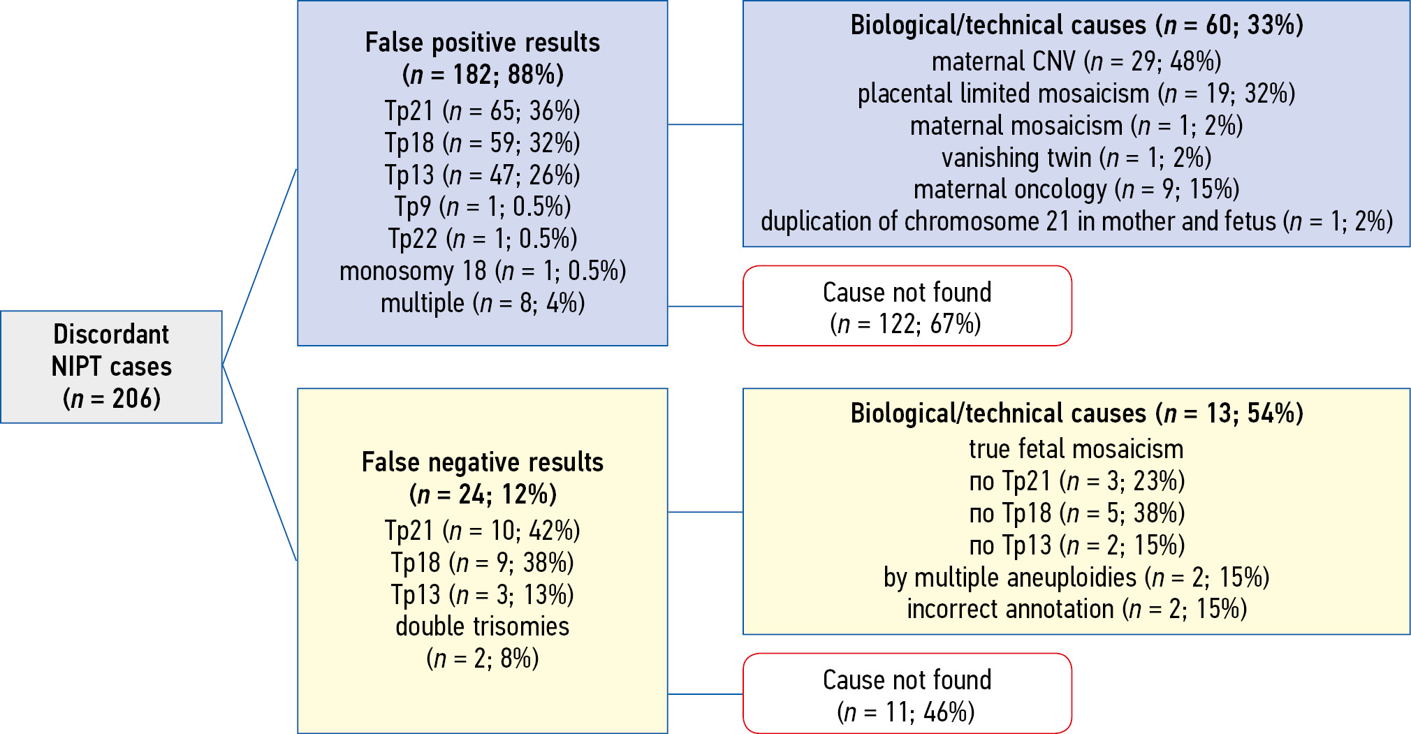 The most common causes of false positive and false negative results cited in many studies are confirmed or suspected low FF; confirmed chromosomal mosaicism of the fetus or mother; maternal copy number variants of DNA regions (CNV); an technical and human factors. Moreover, the cause could not be identified in a significant number of cases.