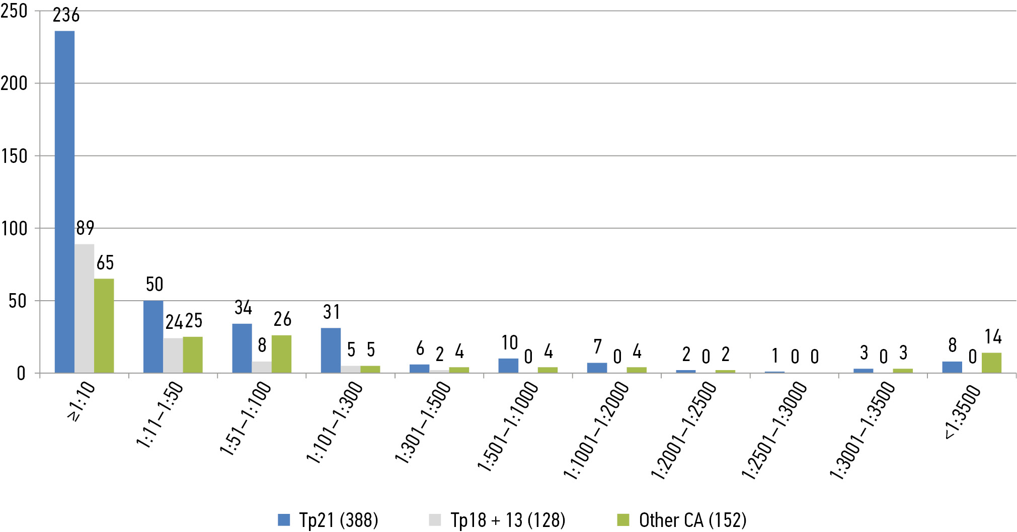 Trisomy 21 | 97 | 0.03 | [21] Calculations for high-risk population per 10,000 pregnancies |