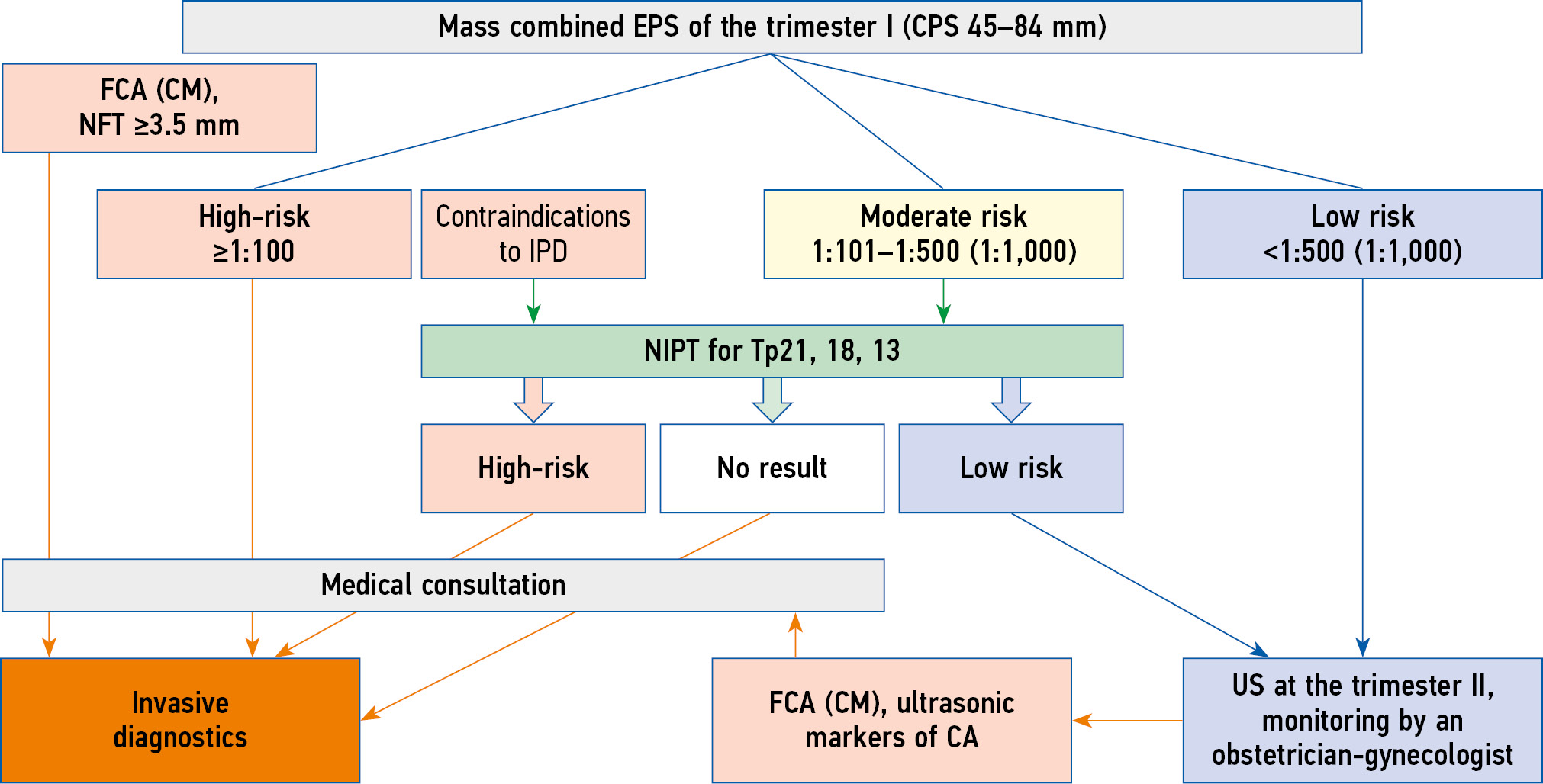 The methodology of combined early prenatal screening (EPS), developed by the Fetal Medicine Foundation (FMF, headed by Prof. K. Nikolaides, London); ultrasound (US) examination performed by specially trained and licensed specialists; and the study of maternal blood serum markers and calculation of the individual risk of CA at a term of 11–14 weeks of gestation are the most successful and demanded methodology. While calculating the risk, the baseline risk (maternal age and gestational age) and the probability ratios of significant factors, such as a number of indicators of anamnesis and maternal status, US and serum markers (free beta-subunit of chorionic gonadotropin [free β-HCG] and pregnancy-associated plasma protein A [PAPP-A]), are considered [1]. According to the above algorithm, the systematic Cochrane Review analyzed the data of combined prenatal screening for Down syndrome (Tr21) in the first trimester of pregnancy. The review included 152 publications over 31 years (1,604,040 screening results of 8,454 Tr21 cases) and demonstrated a screening sensitivity of more than 90% with 3–5% false positive results (FPR). The effect of this screening model was also manifested in a sharp decrease in the size of the high-risk group of CA and the number of invasive procedures, previously based mostly on maternal age and serum markers [2].