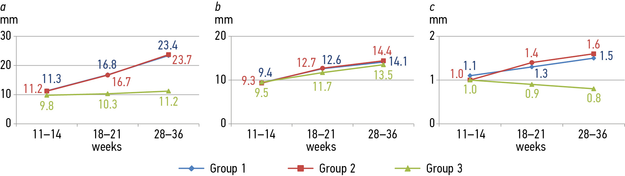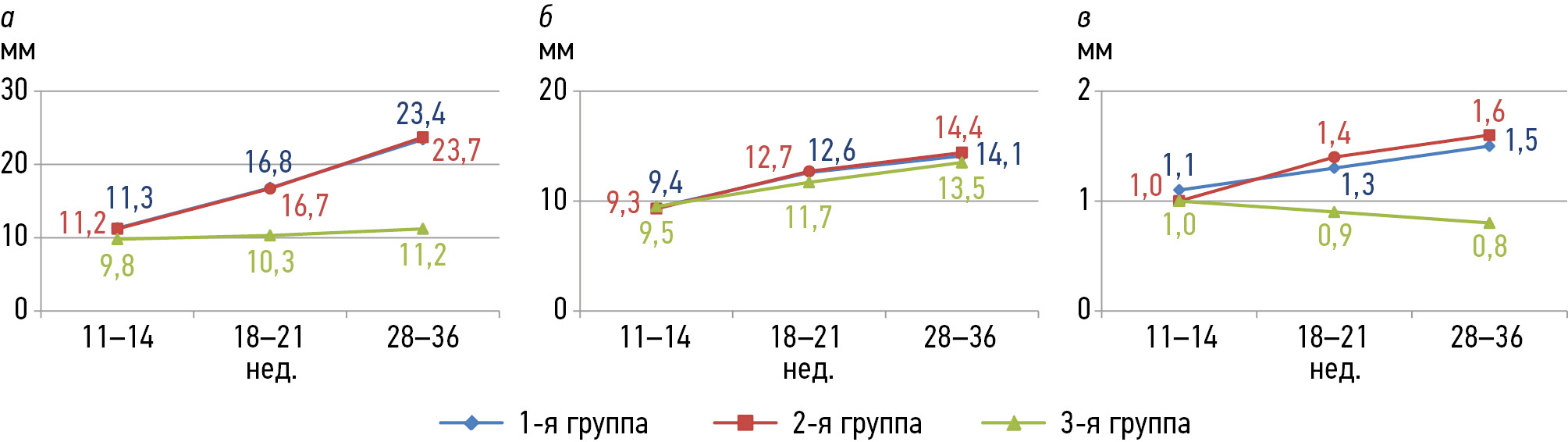 Fig. 1. Dynamics of preperitoneal fat thickness (a), subcutaneous fat thickness (b), abdominal wall fat index (c) in pregnant women of the comparison groups