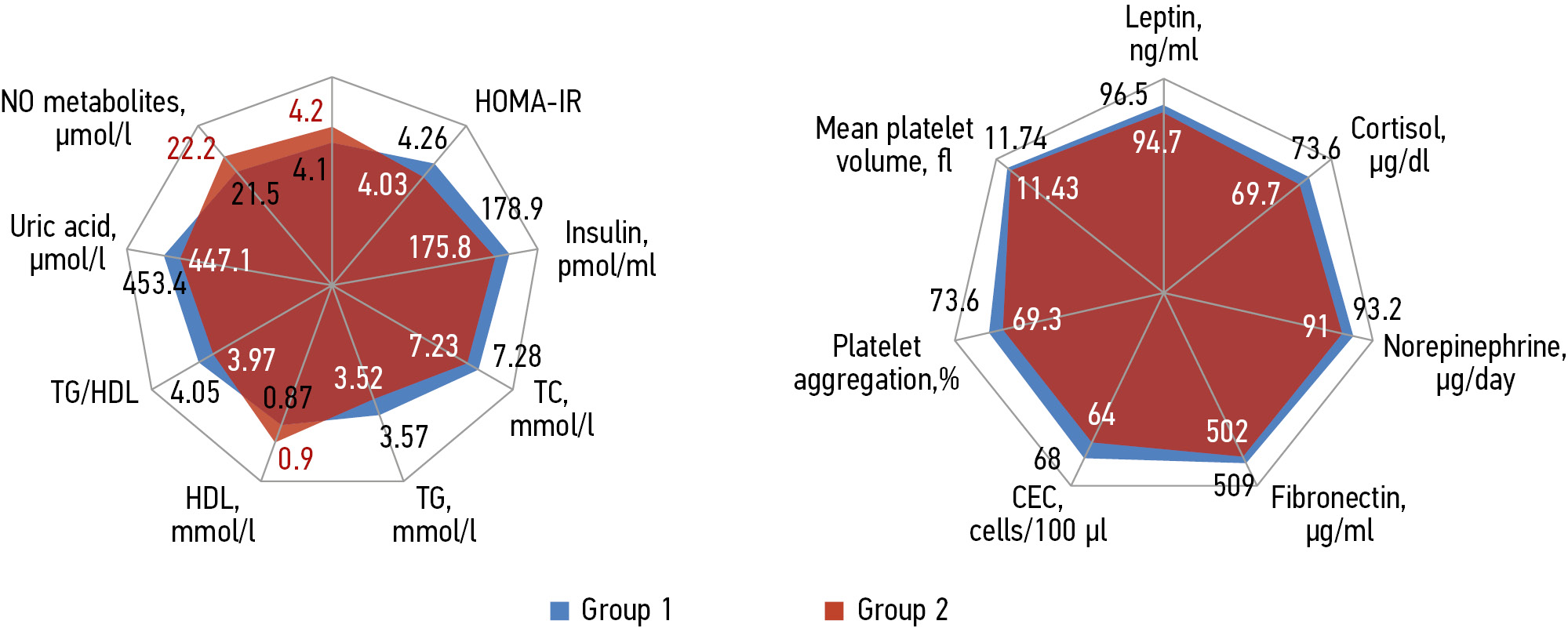 Fig. 2. Values of laboratory parameters in pregnant women of groups 1 and 2 with clinical manifestation of preeclampsia: TG, triglycerides; HDL, high-density lipoprotein; TC, total cholesterol; CEC, circulating endothelial cells; HOMA-IR, Homeostasis Model Assessment of Insulin Resistance