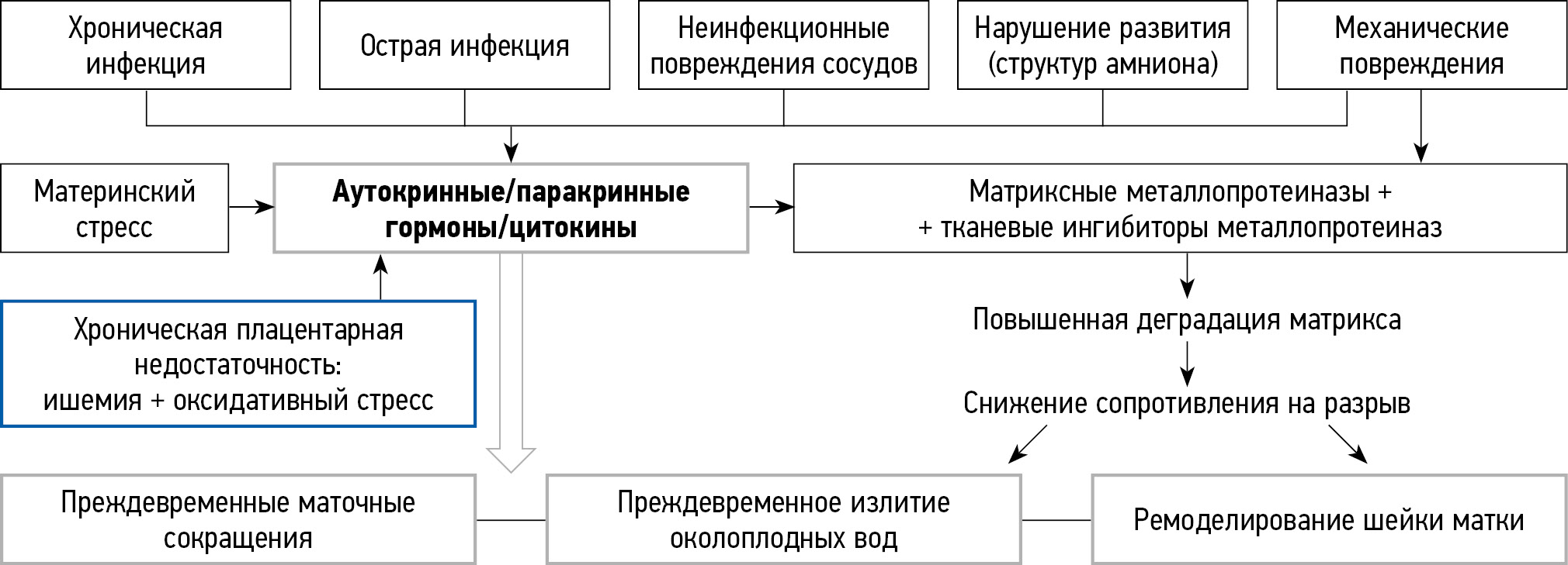 Fig. 1. Pathological processes that potentially occur in preterm delivery by influencing autocrine/paracrine hormonal regulation ([21], as amended)