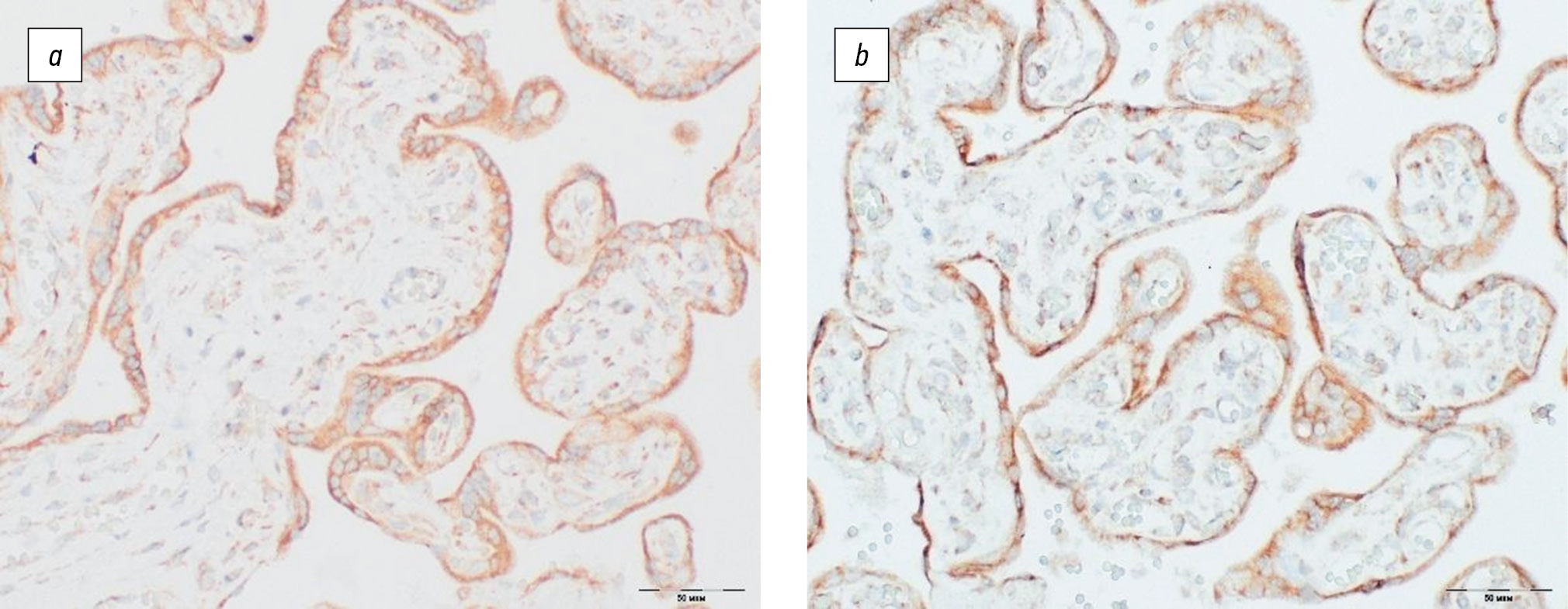 Fig. 3. Expression of relaxin-2 in the villous chorion of the placenta of dichorionic twins: a — in spontaneous preterm delivery; b — in delivery at term. Immunohistochemical staining, 400×