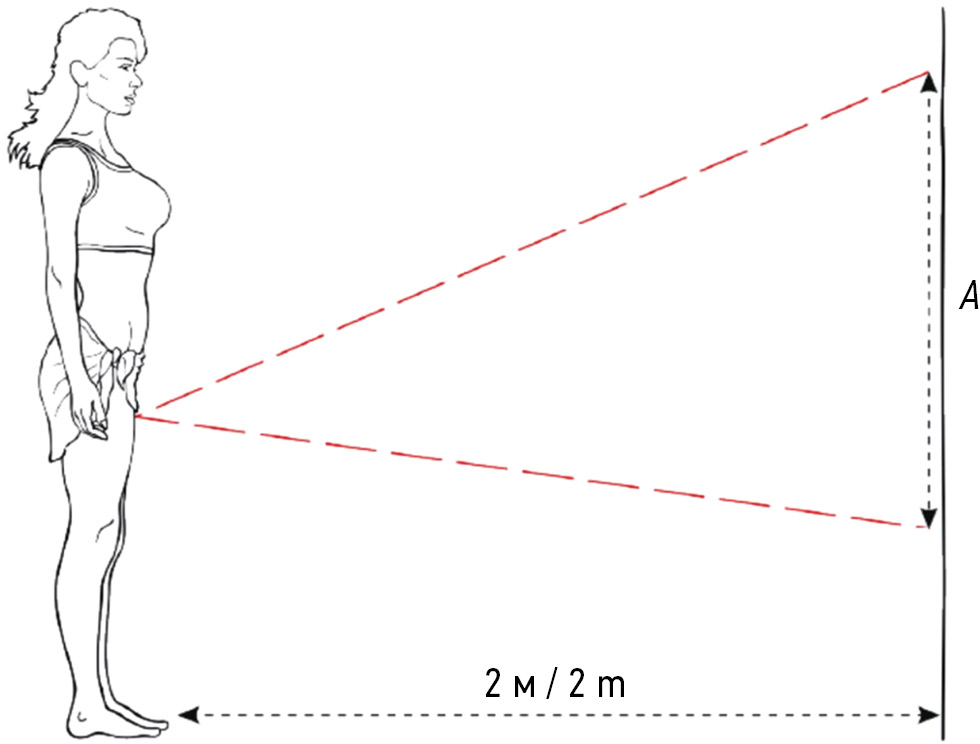 Рис. 2. Изменение положения лазерного луча во время сокращения мышц тазового дна и измерение амплитуды лазерного луча (А). Расстояние до стены — 2 м