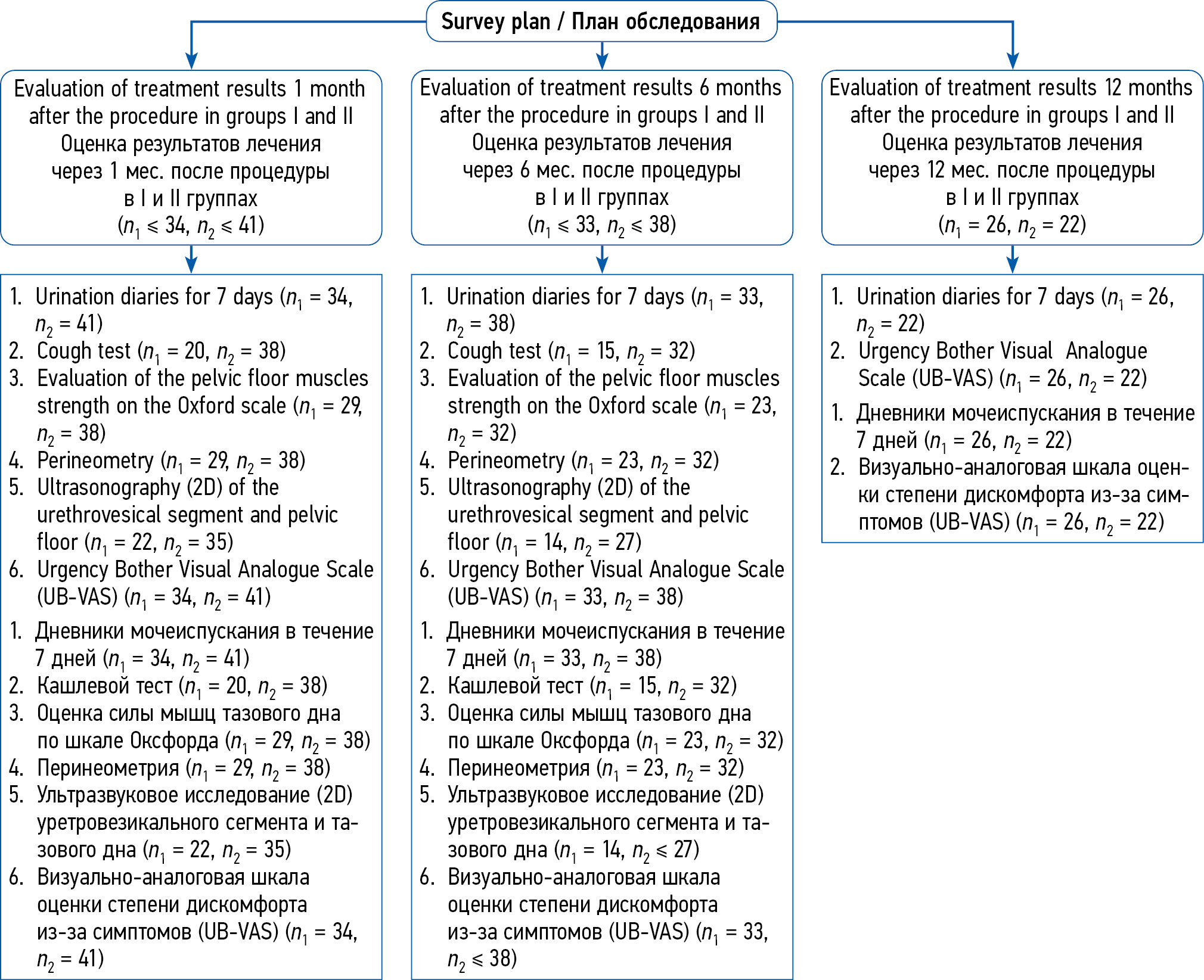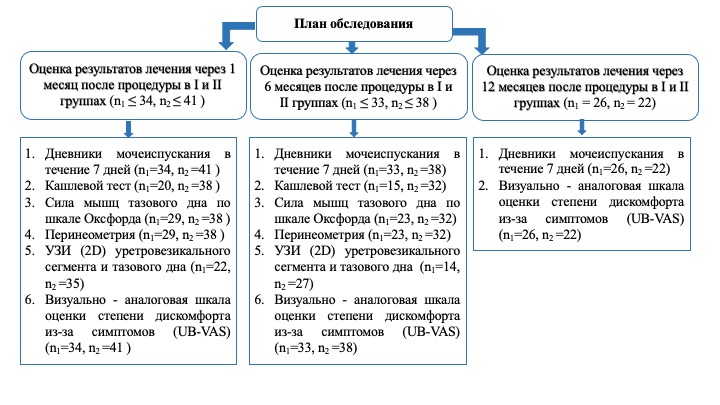 MATERIALS AND METHODS: We examined 82 patients aged 43.35 ± 6.25 years with mild to moderate stress urinary incontinence combined with grade I to II genital prolapse. After general clinical and special studies, including voiding diaries, Urgency Bother Visual Analogue Scale, cough test, ultrasound of the urethrovesical junction and pelvic floor, 41 women were prescribed a course of remote pelvic floor muscle training under medical supervision using the Tyulpan laser vaginal simulator (group I). 41 patients underwent paraurethral injection of 4.0 ml of high-density hyaluronic biopolymer crosslinked with 1,4-butanediol diglycidyl ether (group II). The effectiveness of therapy was evaluated one, six and 12 months after the start of treatment.