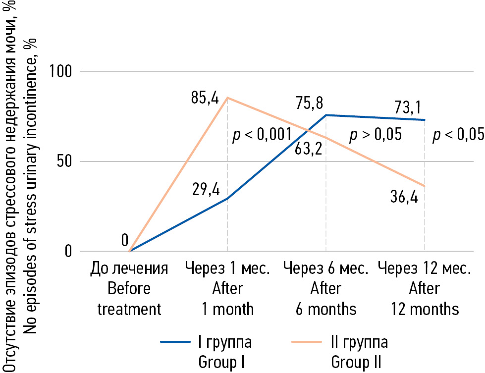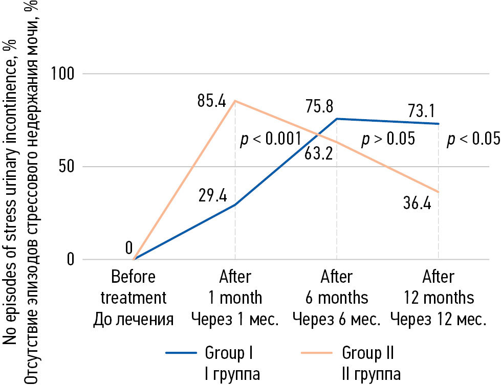RESULTS: After one month, the absence of stress urinary incontinence episodes based on voiding diaries was found in 29.4% of patients in group I and in 85.4% of patients in group II (2.9 times more often) (p < 0.001); after 12 months, in 73.1% of patients in group I and in 36.4% of patients in group II (half as often) (p = 0.011). After one month, a negative cough test was detected in 65.0% of women in group I and in 92.1% of women in group II (1.4 times more often) (p = 0.023). After six months, the results of treatment for stress urinary incontinence based on the cough test were not different and amounted to 80.0% in group I and 71.9% in group II (p = 0.725). When assessing the pelvic floor muscle strength using the Oxford Scale and perineometry, an increase in strength after one and six months was detected in 100% of patients in group I (p < 0.001). Both techniques equally reduced urethral mobility as measured by ultrasound over the one-month follow-up. Pelvic floor muscle training more significantly improved the quality of life of women 12 months after the start of therapy (p < 0.05).