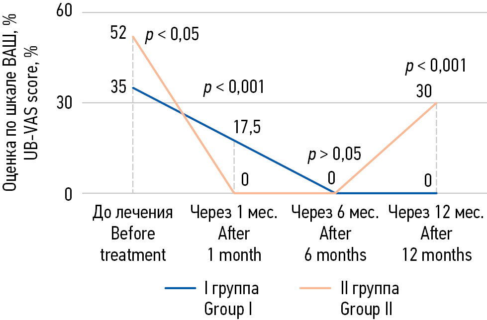 Рис. 6. Сравнение оценки степени дискомфорта из-за симптомов по визуально-аналоговой шкале (ВАШ) при лечении дисфункции тазового дна у женщин в I и II группах в течение 12 месяцев