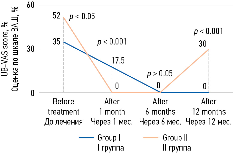 Fig. 6. Comparison of Urgency Bother Visual Analogue Scale (UB-VAS) scores in the treatment of pelvic floor dysfunction in patients in groups I and II for 12 months