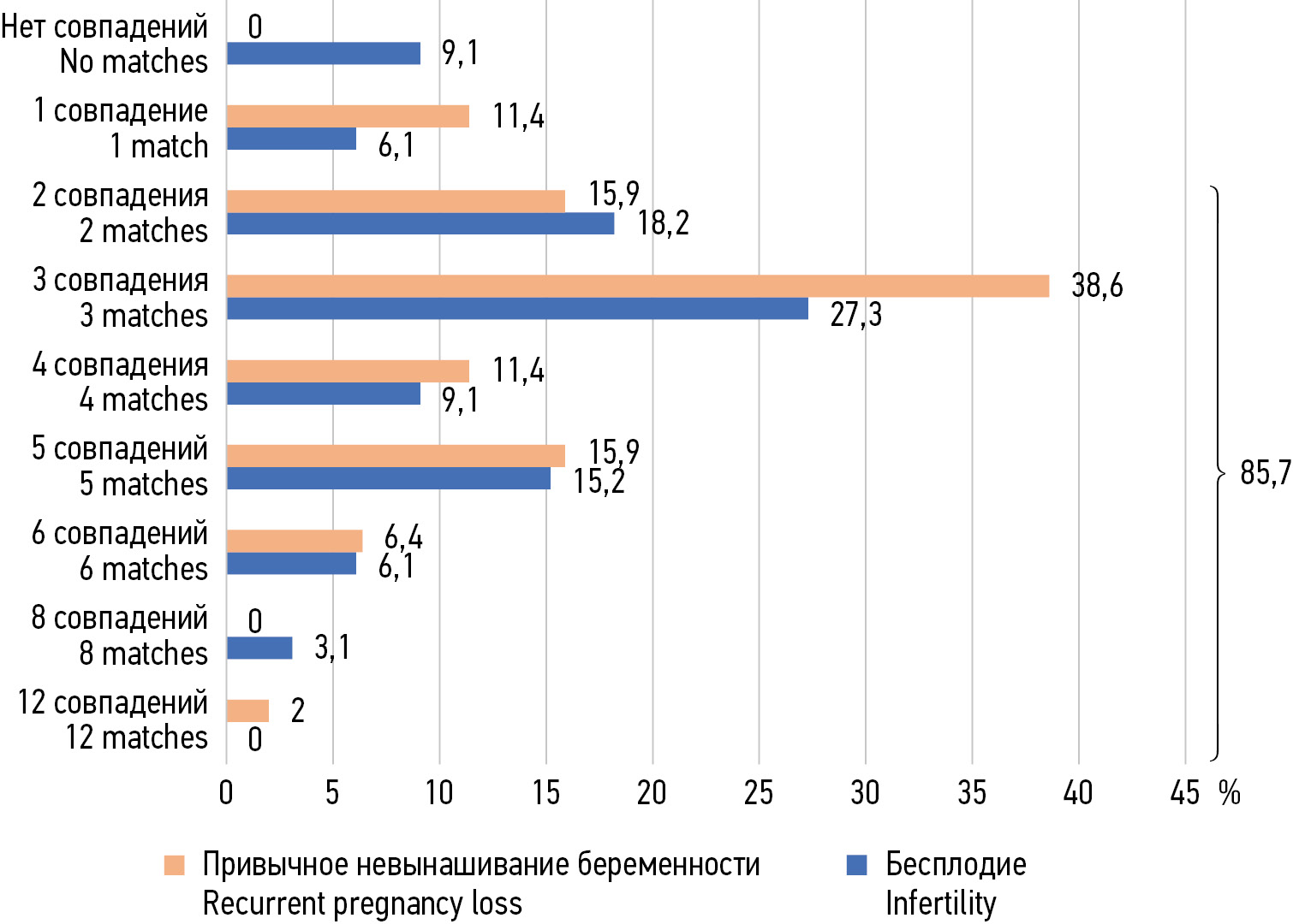 Так, среди супружеских пар с репродуктивными нарушениями (бесплодием, повторными неудачами имплантации при ЭКО и привычным невынашиванием беременности) в 85,7 % случаев установлено совпадение по двум аллелям в системе HLA II класса и более (рис. 1). В парах с репродуктивными нарушениями диагностировано совпадение по 2 аллелям у 16,9 % пар, по 3 — у 33,7 %, по 4 — 10,4 %, по 5 — у 15,6 %, по 6 — у 7,8 %. У двух пар установлено совпадение по 8 и 12 аллелям в трех локусах DQA1, DQB1, DRB1. Из 33 супружеских пар с бесплодием совпадения по двум аллелям и более обнаружено у 79 %, а из 44 пар с привычным невынашиванием беременности — у 90,5 % (р < 0,05).