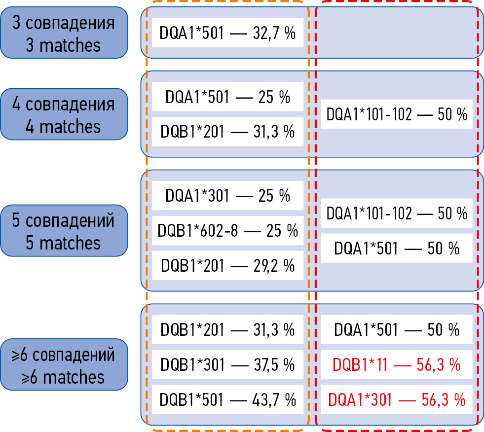 В зависимости от количества совпадений проанализирована частота совпадений у аллелей трех локусов DRB1, DQA1, DQB1 и выделены наиболее значимые (рис. 2).