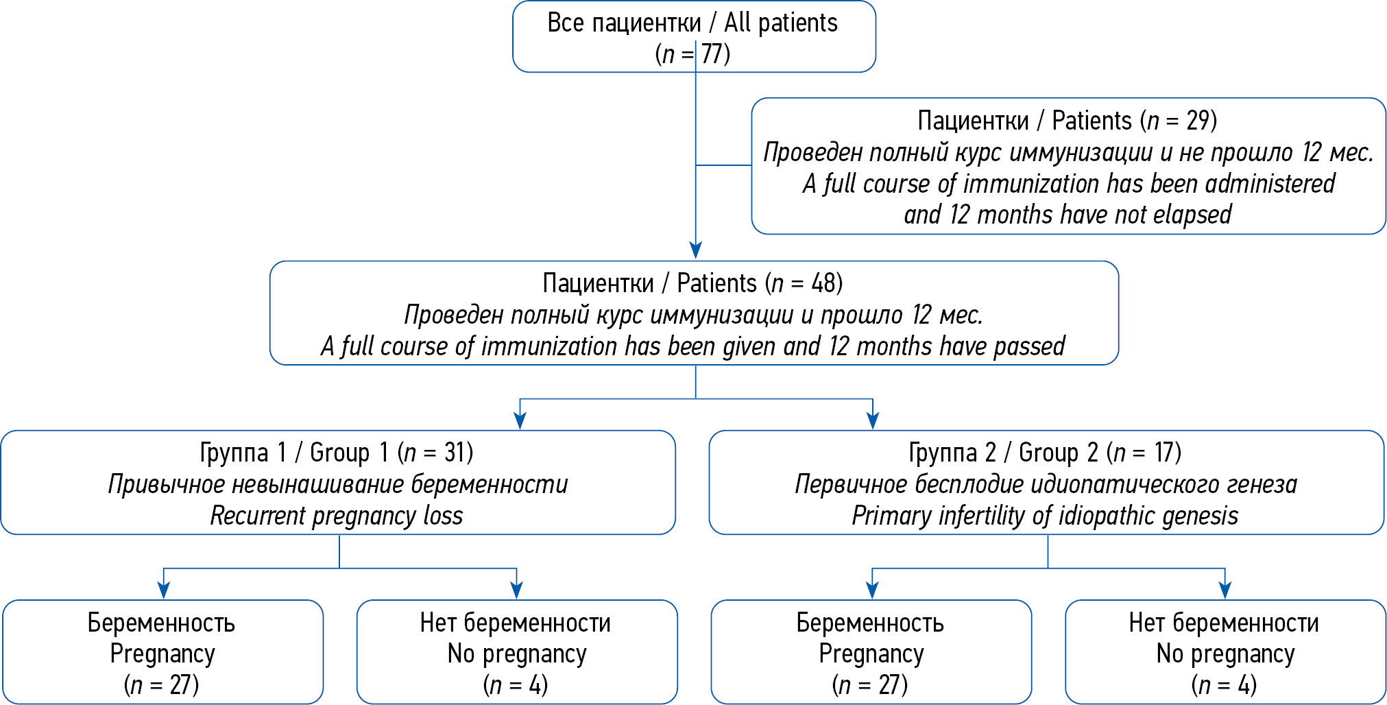 В период предгестационной подготовки рекомендована барьерная контрацепция. С третьего м. ц. контрацепция отменена. Наступление беременности регистрировали в течение 12 последующих м. ц. При отсутствии наступления беременности проводили «доиммунизацию» через 6 м. ц. после последней процедуры однократно.