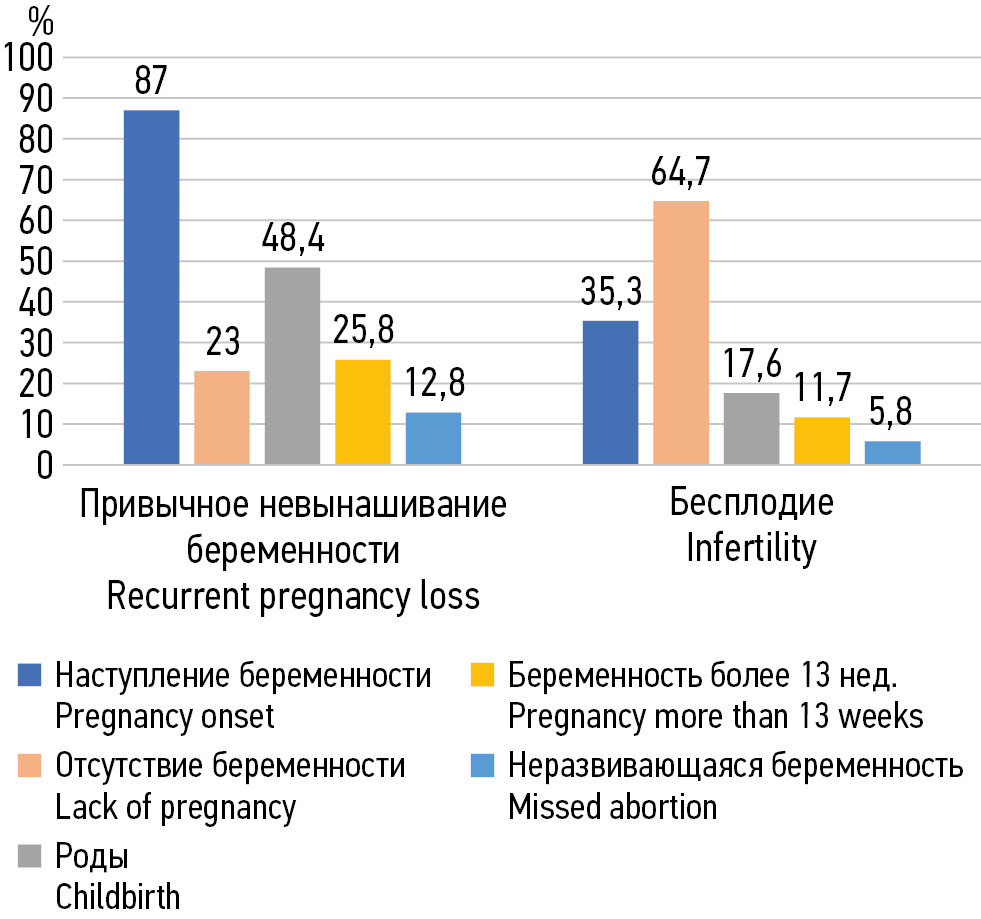 До решения вопроса о назначении цитотерапии все женщины с отягощенным репродуктивным анамнезом из группы исследования прошли многолетний путь диагностики для выявления возможных причин данной патологии и патогенетическую терапию. Наиболее часто встречались воспалительные заболевания органов малого таза (56,5 %), урогенитальные инфекции (46,4 %). Гормональные нарушения (синдром поликистозных яичников, неклассическая форма врожденной дисфункции коры надпочечников, нарушение лютеиновой фазы / ановуляция, нарушение менструального цикла) диагностированы у каждой 7-й женщины (14,2 %). Наружный генитальный эндометриоз и/или аденомиоз диагностирован у 12,9 % пациенток. У 19,5 % женщин был повышенный уровень антител к аннексину V и хорионическому гонадотропину человека. Так, практически в половине случаев встречались воспалительные заболевания органов малого таза и урогенитальная инфекция, причем их лечение выполнено в полном объеме. После коррекции гинекологической и экстрагенитальной патологии и при отсутствии эффекта от назначенной терапии (отсутствии наступления беременности или потере беременности на ранних сроках гестации) рекомендовано более детальное иммунологическое и генетическое исследование.