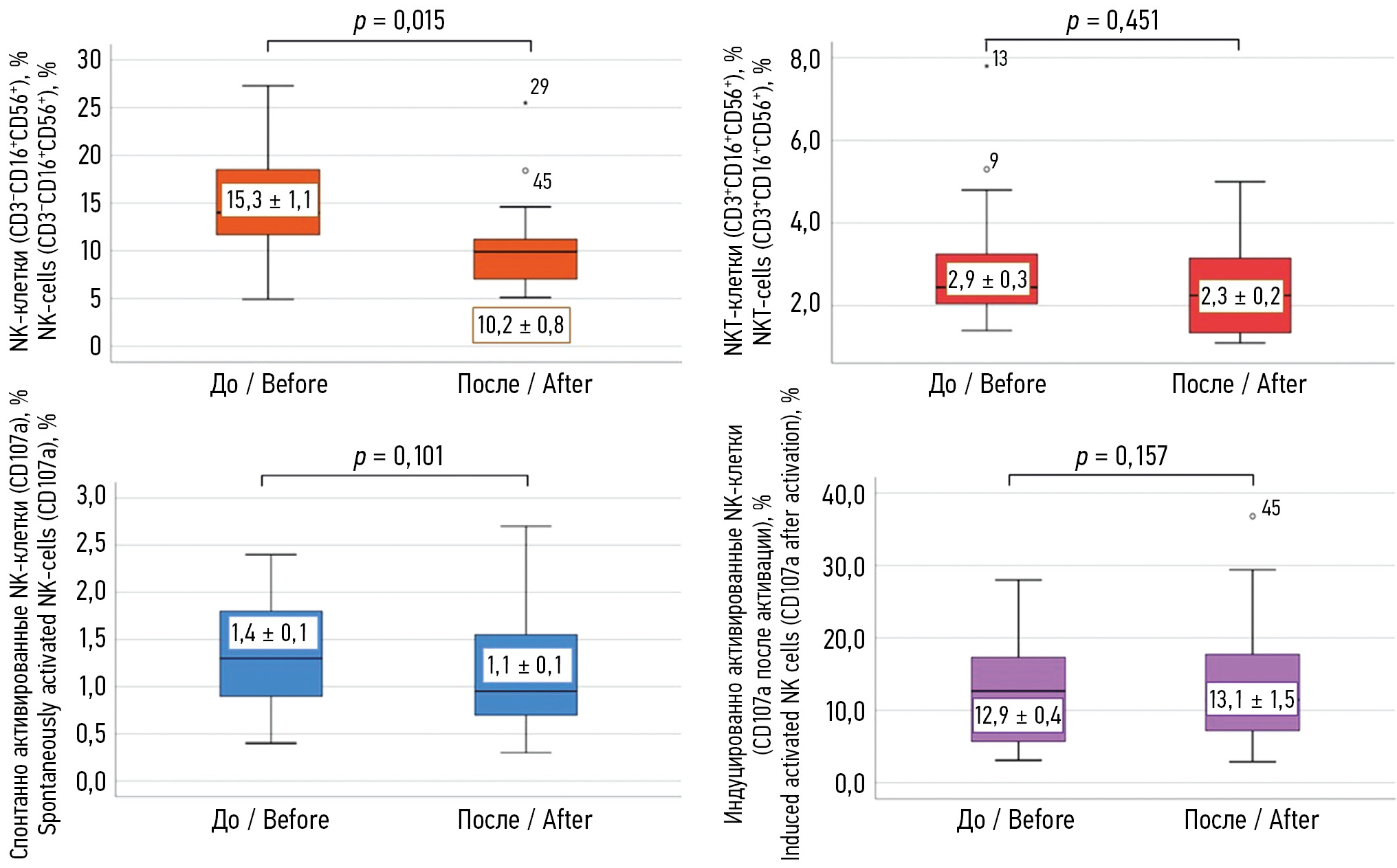 Fig. 5. Natural killer (NK) and natural T-killer (NKT) cell functional activity dynamics in peripheral blood before cytotherapy and two weeks after re-immunization. Dots denote “outliers” from the total statistical analysis group outside the 95% confidence interval