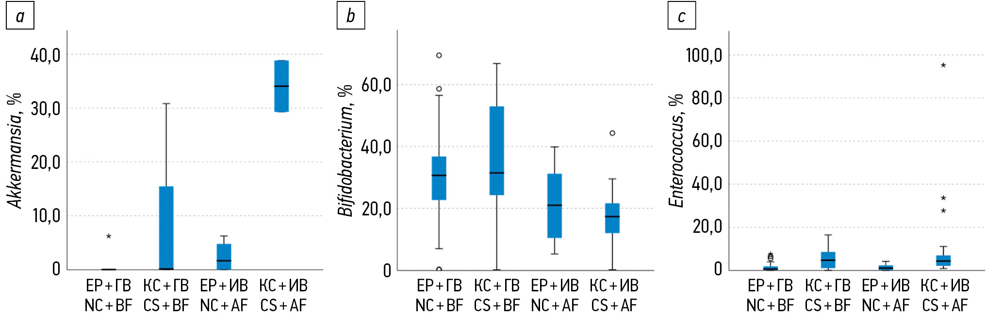 Что касается относительного содержания бактерий рода Enterococcus в составе микробиоты кишечника, отмечено, что их минимальное количество было типичным для детей 1-й группы, рожденных через естественные родовые пути и находившихся на грудном вскармливании, их доля была статистически значимо ниже, чем в 3-й и 4-й группах (0,58, 4,69 и 4,29 % соответственно). Известно, что у детей на исключительно грудном вскармливании отмечают в составе микробиома кишечника меньшее микробное разнообразие и большое количество разных видов Bifidobacterium, Staphylococcus и Streptococcus. А у детей на искусственном вскармливании выявляют более разнообразный микробиом, представленный бактериями Bacteroides, Clostridium, Enterobacteriaceae, Enterococcus и Lachnospiraceae, при определенных условиях способными выступать в роли условно-патогенной микробиоты и провоцировать развитие заболевания [25]. Кроме того, значительное количество исследований показывают причастность бактерий кишечника, доминирующих в составе микробиома после оперативного родоразрешения, в том числе энтерококков, к целому спектру хронических заболеваний, включая ожирение, метаболический синдром, некротизирующий энтероколит, воспалительные заболевания желудочно-кишечного тракта, астма и различные виды аллергий [26–30]. Вероятно, преобладание в составе микробиоты кишечника энтерококков у детей после оперативного родоразрешения (по сравнению с их содержанием у детей, рожденных через естественные родовые пути) способствует формированию более высокого воспалительного потенциала кишечника. Примечательно, что способ вскармливания детей не влияет на относительное содержание энтерококков, а способ родоразрешения — на него воздействует.