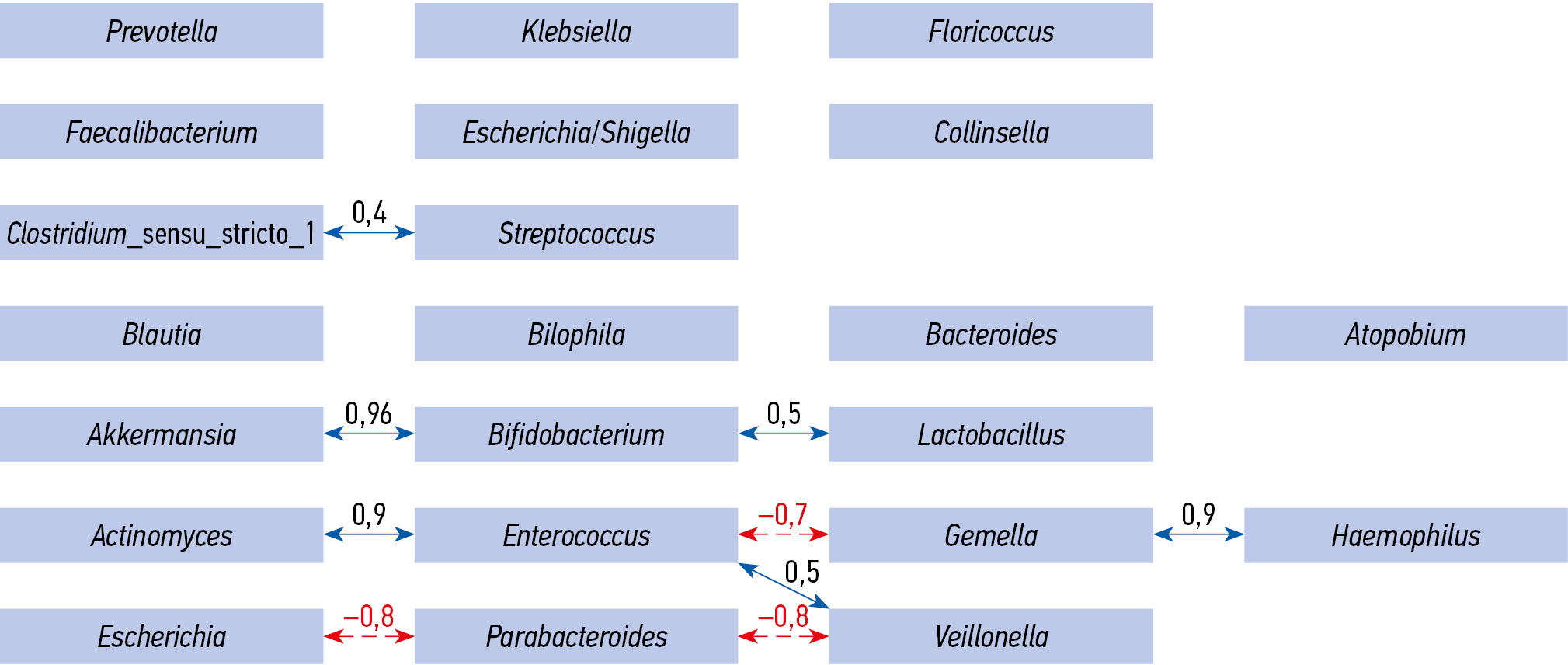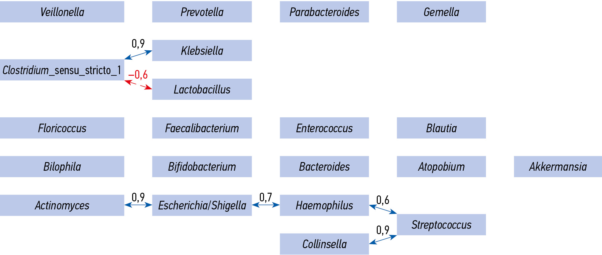 Любопытным представляется корреляционный анализ полученных данных. Особо примечательно количество связей на коррелограммах в четырех группах: количество отрицательных и положительных связей в группах детей, находившихся на грудном вскармливании, было больше, чем в группах детей на искусственном вскармливании. При этом очевидно, что тип родоразрешения также не влиял на количество связей между родами микроорганизмов.
