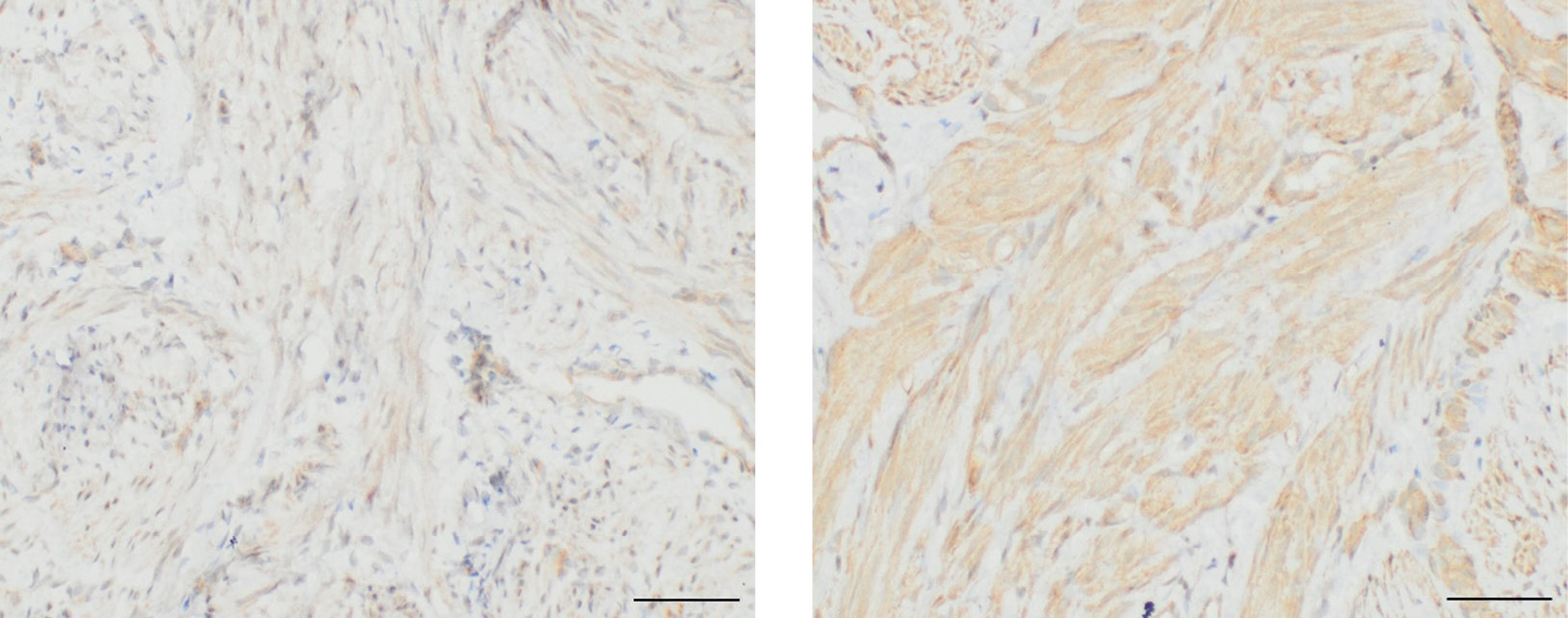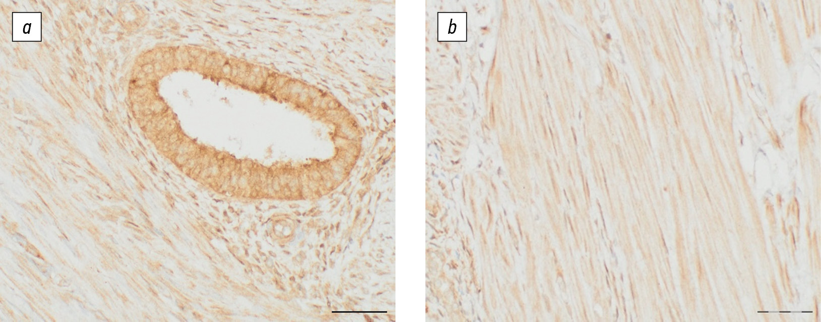 Рис. 2. Экспрессия стресс-индуцированного фосфопротеина 1 в миометрии больных аденомиозом: в очаге аденомиоза (a) и окружающем миометрии (b). Увеличение ×400