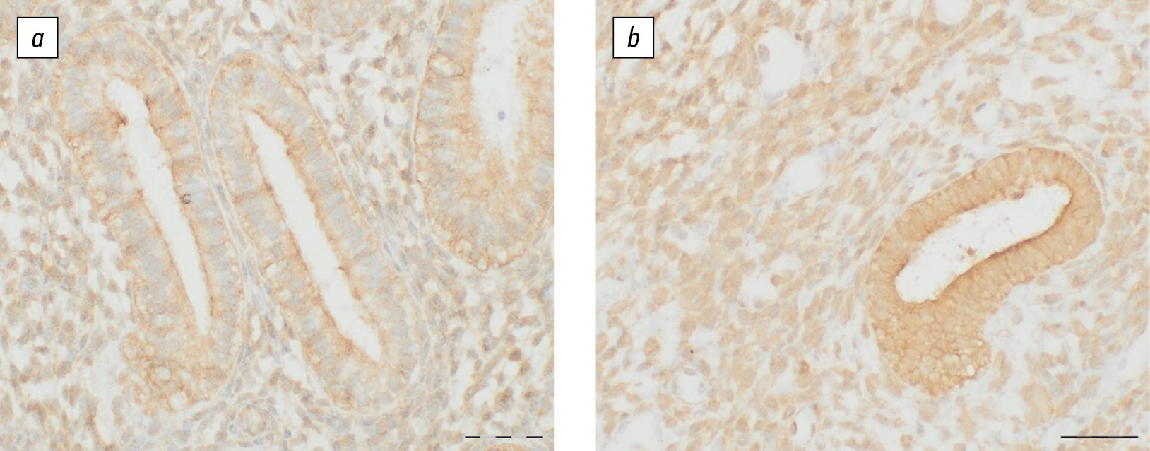 Рис. 3. Экспрессия стресс-индуцированного фосфопротеина 1 в эндометрии женщин контрольной группы (a) и больных аденомиозом (b) в секреторную фазу менструального цикла