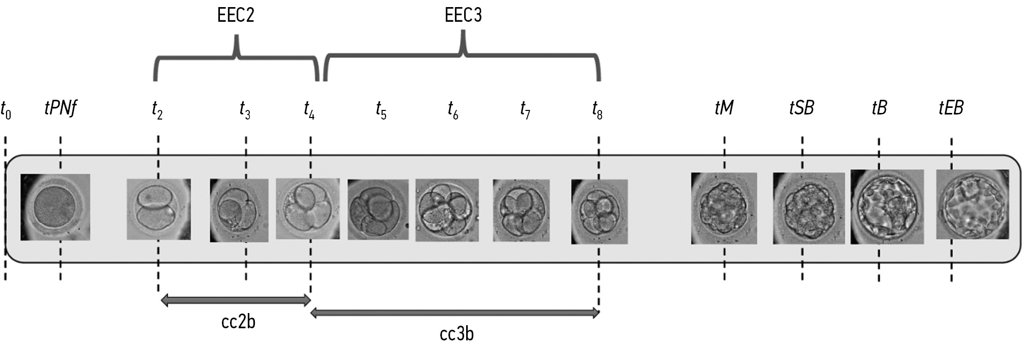 Дополнительно подсчитаны эмбриональные клеточные циклы, в результате которых эмбрион достигает четырех клеток из двух (EEC2, cc2b, t4 − t2) и восьми клеток из четырех (EEC3, cc3d, t8 − t4) (рис. 1).
