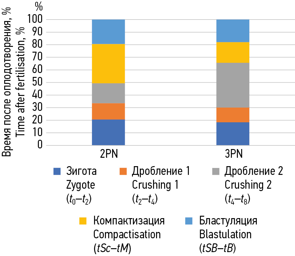 Проанализированы видеоизображения развития 18 донорских эмбрионов. Из них 15 эмбрионов развивались из двупронуклеарных зигот с нормальным оплодотворением (2PN2PB) и 3 эмбриона были с аномальным оплодотворением (3PN2PB, 3PN1PB, 0PN2PB) (рис. 2). Для всех эмбрионов описаны tPNf, t2, t3, t4, t5, t6, t7, t8, t9, tSc, tM, tEB, tB, tH, cc2b, cc3d, рассчитанные в часах после оплодотворения (чпо) и представленные в виде медианы и 95 % оверительного интервала. Усредненные данные развития 15 донорских эмбрионов с нормальным оплодотворением (от зиготы до бластоцисты) станут основой для создания так называемой модели «эталонного» эмбриона.