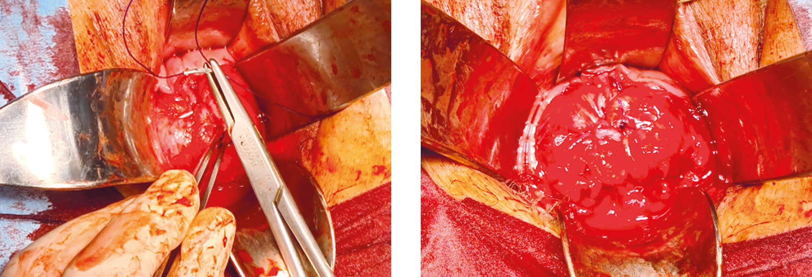 Матку удаляли через кольпотомное отверстие, при этом пересекали собственные связки яичников и маточные трубы. При необходимости матку подвергали фрагментации. Для этого использовали методы ножевой морцелляции, бисекции и коринга. Всем пациенткам проводили двустороннюю тубэктомию, а овариэктомию выполняли в соответствии с показаниями. Затем осуществляли контроль гемостаза и ушивание операционной раны. В заключение выполняли перитонизацию брюшной полости с использованием обвивного шва нитью монокрил 1.0 (рис. 2). С учетом того, что лигатурные культи при данном методе не образуются, и электрохирургический гемостаз маточных связок и сосудов демонстрирует достаточную эффективность, нет необходимости включать в обвивной шов культю коагулированных тканей при ушивании брюшины.